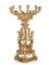 in bronzo dorato a dodici luci. Su una pedana liscia triangolare poggiano tre zampe ferine che sorreggono un''alta base, decorata agli angoli da foglie accartocciate e sui tre lati da ricchi fregi vegetali e costolature baccellate. Dalla base si erge una colonna centrale interamente decorata a motivi vegetali, e circondata da tre tralci a tutto tondo impreziositi da altrettante figure di putti con coppe e grappoli d''uva, sulla quale poggia l''alzata, decorata tutt''intorno da motivi vegetali e grappoli d''uva: dal suo interno si diaprtono dodici bracci portacandela di forma sagomata. Sulla base reca il punzone AUGUSTE BREUL - RUE DE LANCRY N. 5 - A PARIS , alt. cm 84, diam. cm 54