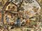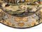 in maiolica decorata in policromia a gran fuoco con verde ramina, bruno di manganese, blu di cobalto, giallo antimonio e dorature, iscritto sulla tesa “ NEAPOLI An.1727” “ Dr. Fra. Ant. Xav. Grue pinxit” . Il corpo del grande piatto in terracotta è ricoperto da uno strato di smalto stannifero dal colore leggermente beigiato. Il retro presenta una finissima crettatura con molte pulci e punte di spillo. Tutto l’ornato è disegnato con una sottilissima linea bruno-arancio (ad esclusione delle fronde arboree e delle parti poi dipinte in blu). La tavolozza dei colori a gran fuoco mostra una scala cromatica dominata dal verde, che vede toni chiari dall’accento olivastro, e dal bruno con stesure beige molto chiare. Il bruno scuro del manganese disegna i dettagli e modella i volumi. Le vesti dei protagonisti portano un beige aranciato e blu chiaro. Lumeggiature auree profilano l’intero tessuto decorativo puntinando gli elementi della tesa, le ali e i tessuti dei putti, oltre ad arricchire tessuti e gioielli delle donne sedute al tavolo e, infine, le fronde fogliate. Il grande piatto tondo ha la tesa leggermente inclinata e l’orlo liscio, mentre la balza scende addolcendo il passaggio al fondo liscio. La tesa è riccamente decorata: l’orlo esterno è profilato con una sottile bordura blu accompagnata da filetti manganese, blu e giallo, la fascia maggiore della tesa vede, sul fondo giallo, quattro importanti elementi barocchi, a cartouche, dominati da conchiglie con ciuffi fogliati, fiori e frutti accompagnati da putti in movimento. I due più in alto sono a mezza figura in scorcio e quello a destra si mostra espressivo mentre gioca con un insetto. Altre “zanzare” abitano i piccoli spazi liberi della tesa. La scena vede protagoniste cinque persone sedute a tavola all’aria aperta davanti ad una locanda, mentre stanno mangiando, servite da due giovani osti: la ragazza con l’abito blu porge un piatto, mentre un giovane uomo versa il vino in un calice. Tre figure sedute ci voltano le spalle: un uomo, un ragazzino e una signora dalla veste arancio decorata con una puntinatura dorata. Davanti a lei vi è la donna più giovane: una ragazza elegante che sembra rivolgere serenamente il suo sguardo verso l’osservatore; le è accanto il giovane uomo sorridente che porge il proprio calice all’oste.