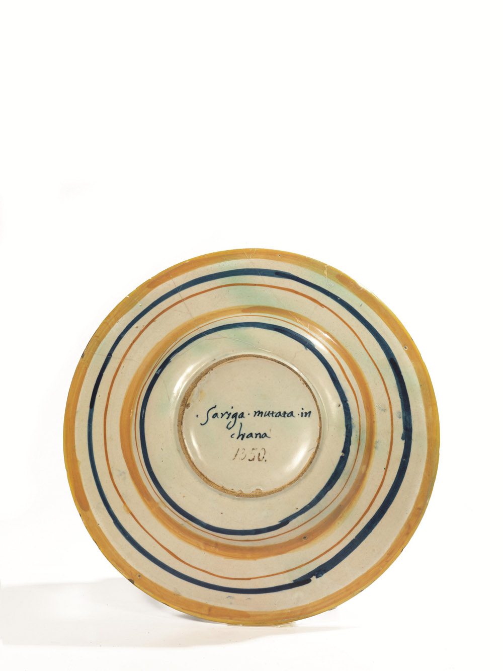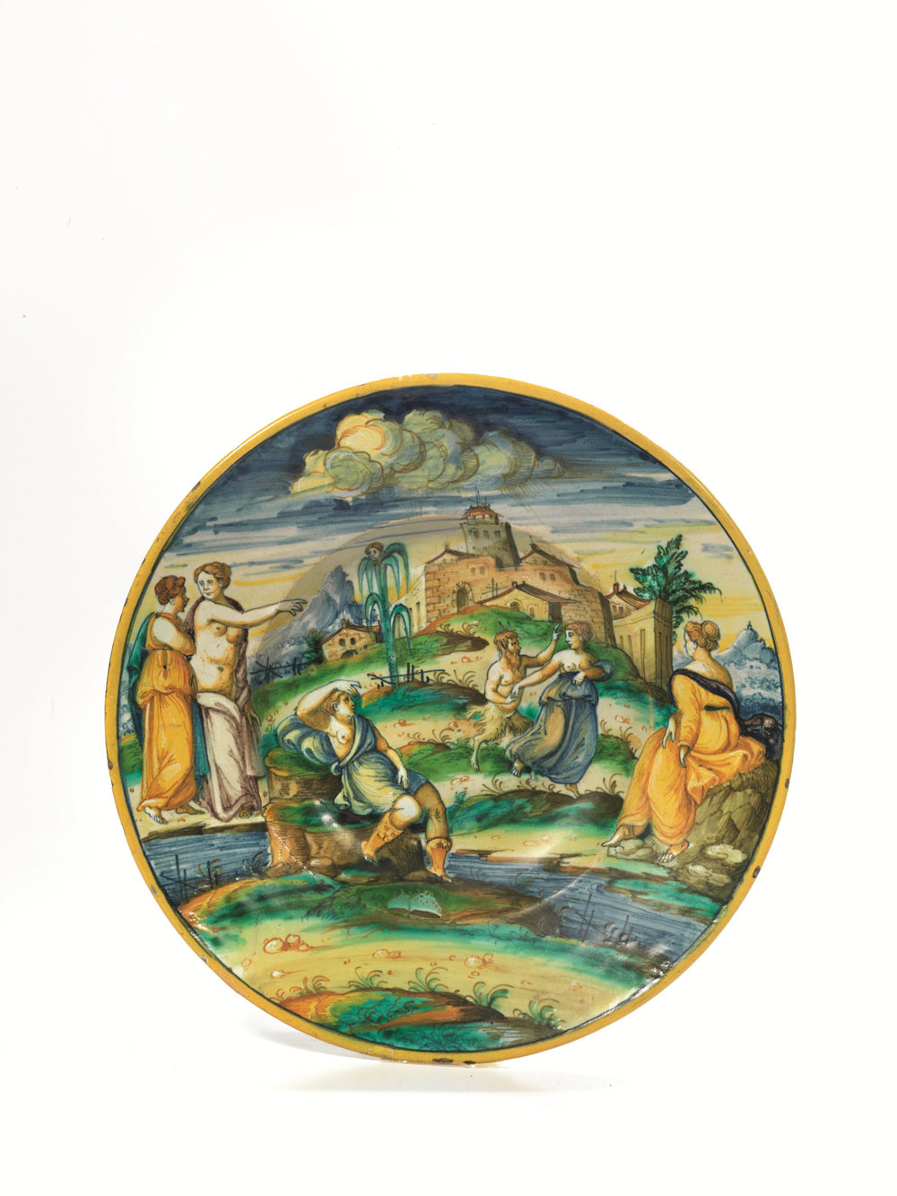 in maiolica decorata in policromia, raffigurante il mito di Pan e Siringa , come indicato nella legenda delineata sotto il piede: “ Sariga.mutata.in / chana ” (Ovidio, Metamorfosi , I, 689-712). Pan, figlio di Ermes, si innamorò di Siringa, ninfa seguace di Diana, la quale per sfuggire al satiro invocò le Naiadi che la mutarono in canne palustri. Pan, trovandosi allora davanti a un canneto, ne udì il suono prodotto dal vento e le utilizzò per creare uno strumento musicale: la siringa appunto. Per modalità pittoriche e stilistiche il piatto in oggetto va collocato in quella produzione di piatti istoriati con modalità coerenti con la produzione urbinate o pesarese prodotti in area veneta alla metà circa del secolo XVI, come dimostrano ad esempio le opere del pittore Mazo o quelle più tarde della bottega di Mastro Domenico; alt. cm 5,5, diam. cm 30,2, diam. piede cm 11,1