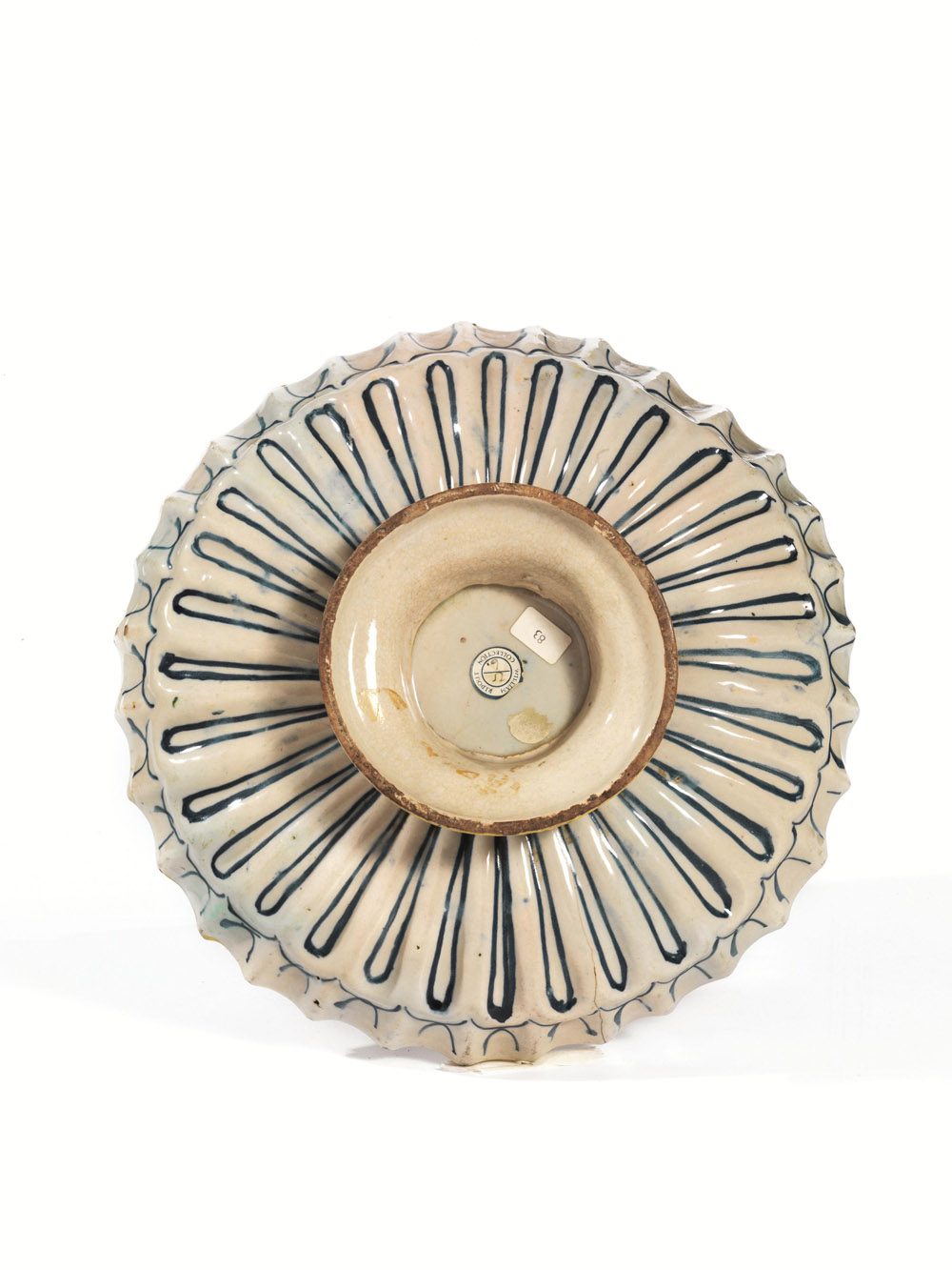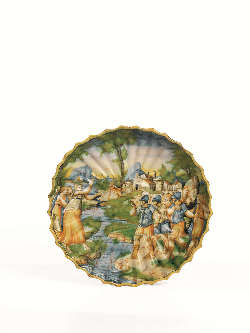 in maiolica dipinta in policromia, tipica foggia a larghe baccellature che convergono a raggera verso l’umbone largo e costolato, poggiante su un alto piede appena svasato. Il retro è interamente smaltato e mostra un motivo decorativo in blu, a sottolineare le baccellature. Sul fronte è descritta una scena istoriata che riproduce l’episodio Virgiliano di Metabo e Camilla : Metabo, re dei Volsci, inseguito dai nemici e impossibilitato ad attraversare il fiume Amaseno con la figlioletta in braccio, la lanciò sulla sponda opposta legata ad un giavellotto, dopo averla consacrata alla Dea Diana. Lo stile pittorico ci pare molto prossimo a quello di un pittore anonimo, noto come “il pittore di Zenobia”, o almeno ad un artefice a lui molto vicino. Tale attribuzione sembra essere confermata da Carmen Ravanelli Guidotti, che cita una crespina con Metabo e Camilla tra le opere ascrivibili alla bottega pesarese (C. Ravanelli Guidotti, Collezione Chigi Saracini. Maioliche Italiane, catalogo della mostra, Firenze/Siena 1992, pp. 100-108 n. 22) . Numerose sono ormai le opere che si raccolgono attorno a questa personalità artistica attiva a Pesaro alla metà del secolo XVI. Questa crespina sotto il piede reca un’etichetta “WILLIAM RIDOUT COLLECTION” con l’iscrizione “U 6” aggiunta a matita, ad indicare la provenienza dalla celebre raccolta William Ridout, dispersa in un’asta londinese nel 1938; alt. cm 7,2, diam. cm 27,5, diam. piede cm 12,4