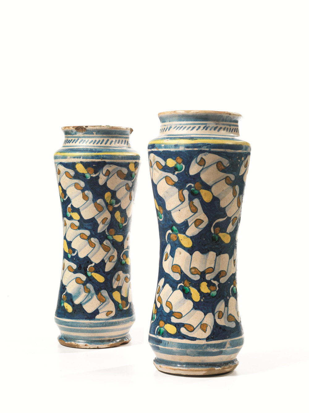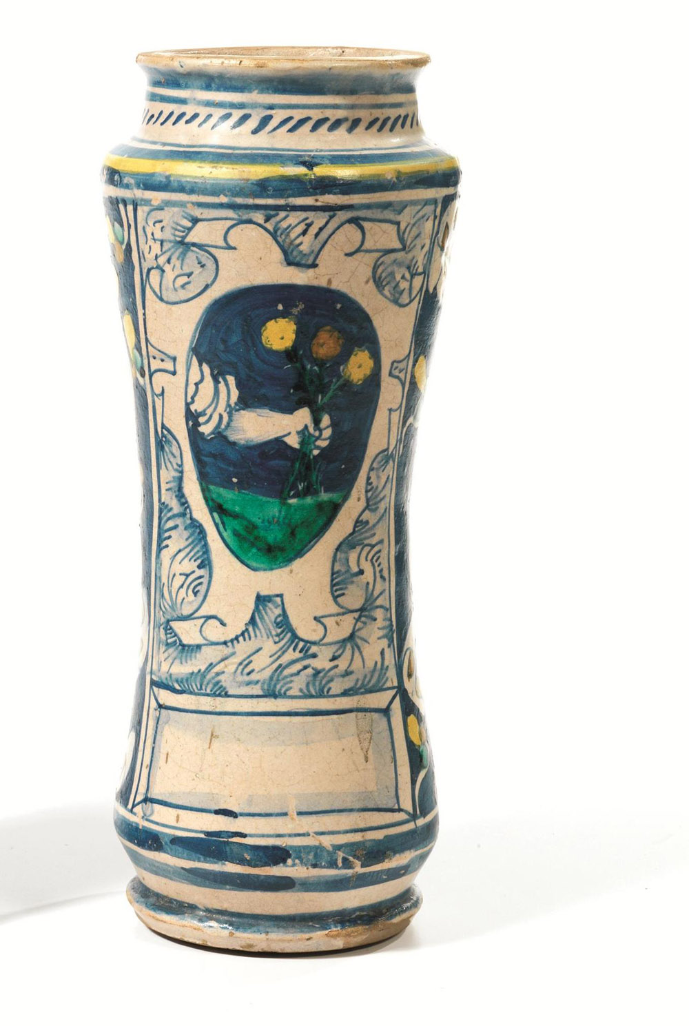 in maiolica decorata a policromia con motivo araldico sul fronte: il vaso presenta corpo cilindrico con base carenata e piede piano definito a stecca; spalla stretta e angolata, bocca ampia con orlo appena estroflesso. La superficie è interamente ricoperta da smalto color crema azzurrato, su cui è tracciato un motivo a nastri ripiegati dal profilo netto, delineati a risparmio su fondo blu. Sul fronte un emblema con un braccio che porta tre boccioli. L’albarello per morfologia e decoro può essere riferito alla produzione trapanese della fine del secolo XVII, alt. cm 29,2, diam. bocca cm 10, diam piede cm 9,5