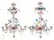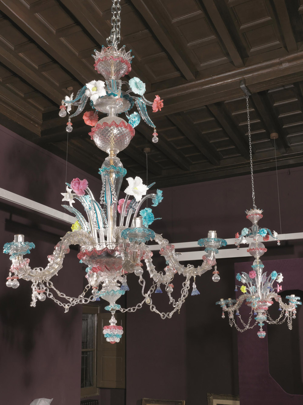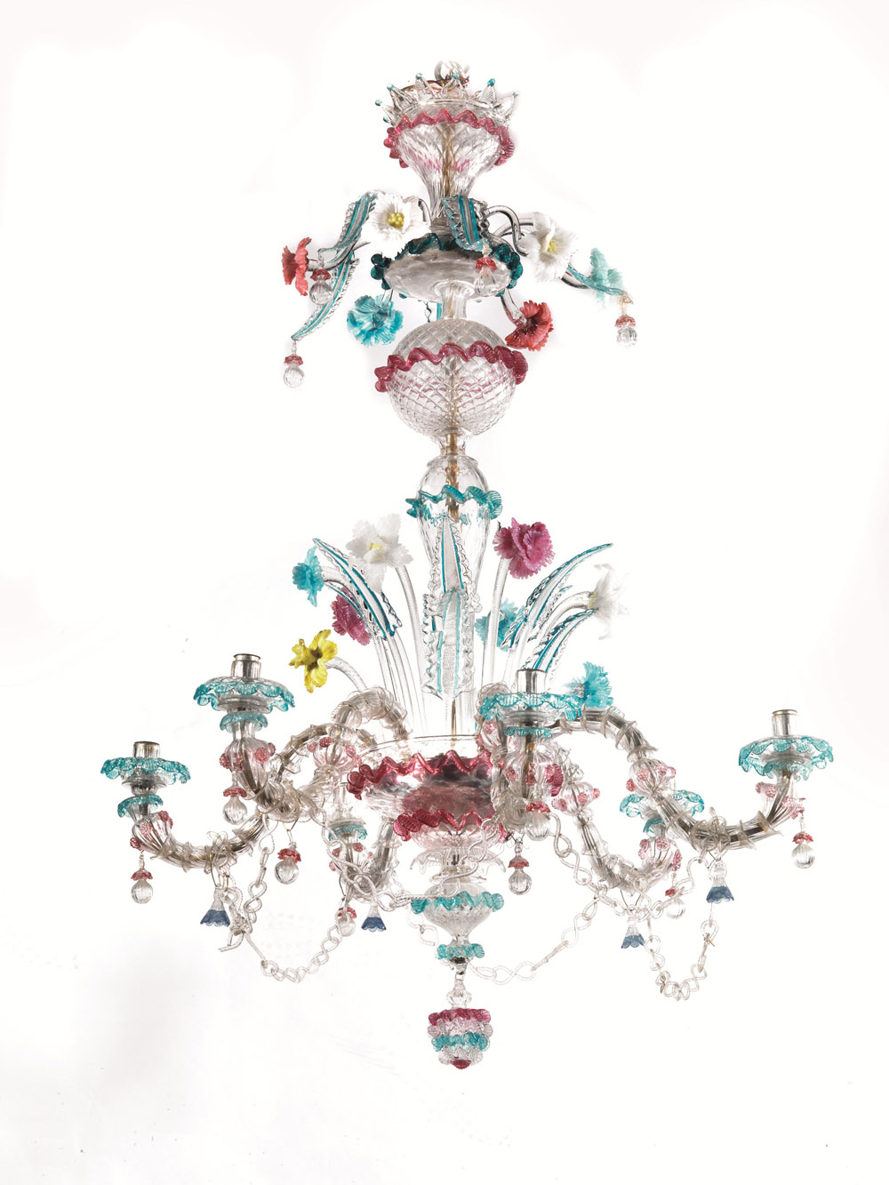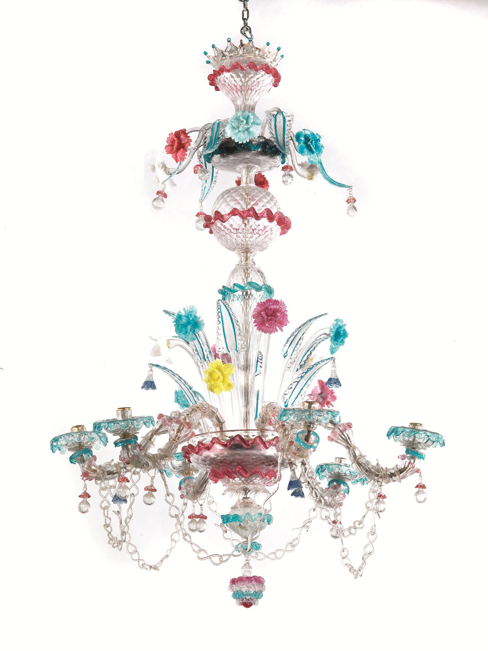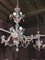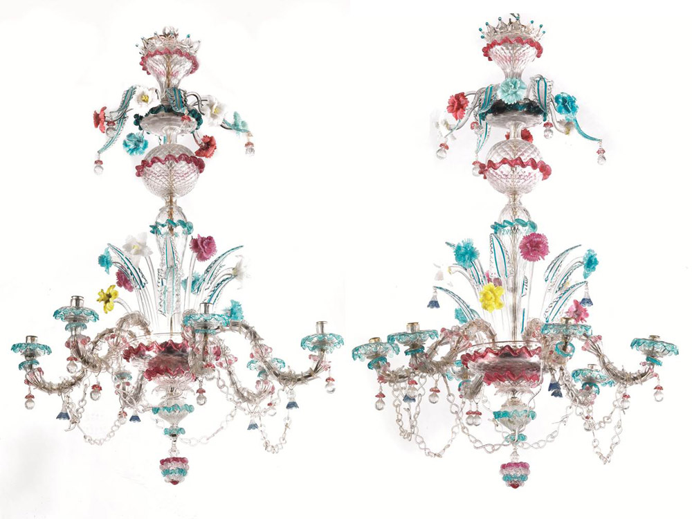 in vetro incolore e policromo a sei luci: il palco inferiore regge sei bracci ricurvi collegati da catenella e alternati a foglie e fiori di diversa foggia, il palco superiore decorato solo da fiori e foglie policromi, alt. cm 124, diam. cm 84 (2)