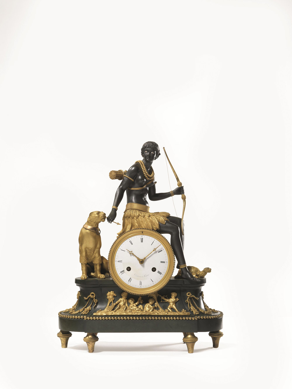 in bronzo patinato e dorato; base ovale decorata a rilievo con scene di putti che giocano e festoni, quadrante circolare in smalto con numeri romani per le ore e piccoli numeri arabi per i minuti firmato Piolaine à Paris , sormontato da figura femminile seduta raffigurante l''Africa affiancata da leonessa e tartaruga. Questo modello è attribuito a Jean-Simon Deverberie, cm 46x36x13