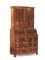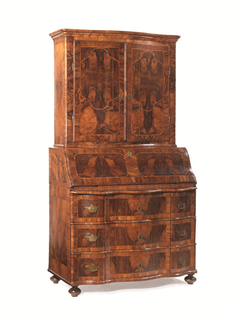 in noce e radica di noce con filettature in acero, fronte mosso a tre cassetti, ribalta con sei cassetti su due file centrati da vano a giorno celante tre cassetti e un altro vano a giorno con segreti, alzata a doppio sportello terminante con cappello modanato, piedi a cipolla, cm 215x115x70