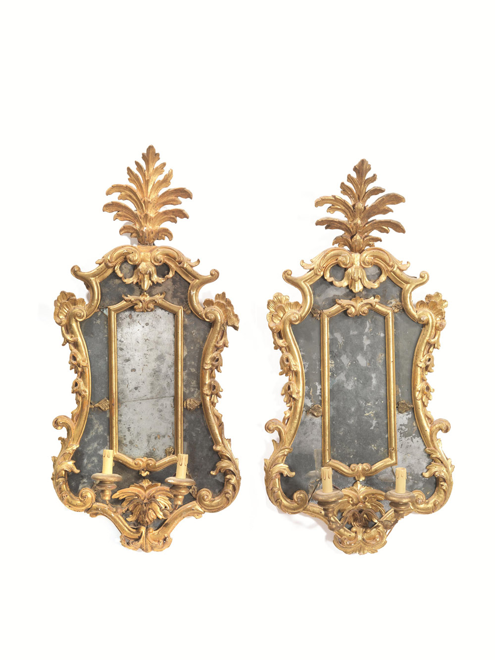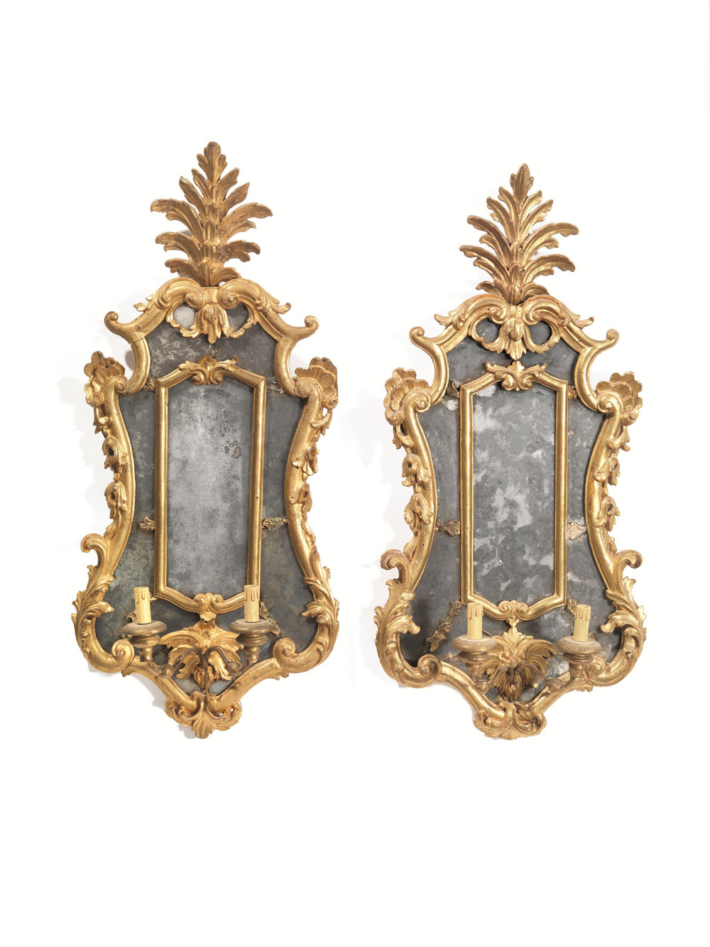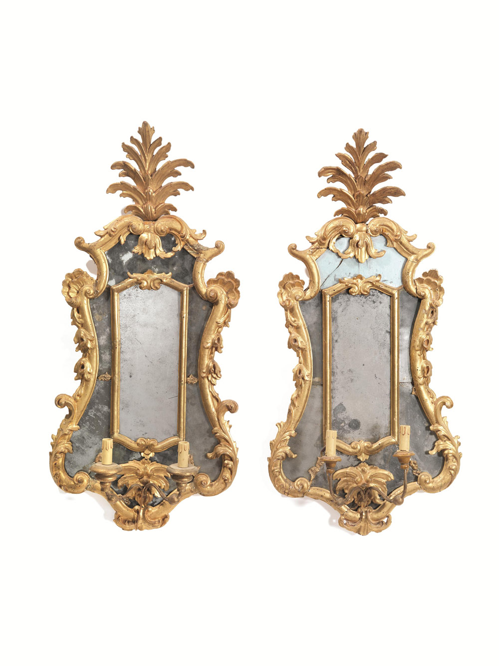 in legno dorato e intagliato a tralci e volute fitomorfi di gusto rocaille , sormontate da alta cimasa a palmetta, cornice sagomata; nella parte inferiore due braccetti portacandela adattati ad elettricità cm 105x49 circa (6)
