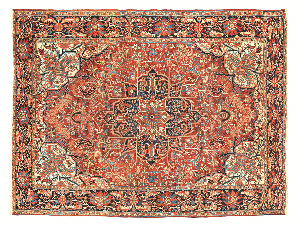 TAPPETO HERIZ, PERSIA, INIZI SECOLO XX fondo rosso mattone con medaglione blu e rosa, nel campo vari motivi stilizzati avorio e azzurro, riquadri avorio con bordura blu, cm 350x267