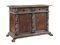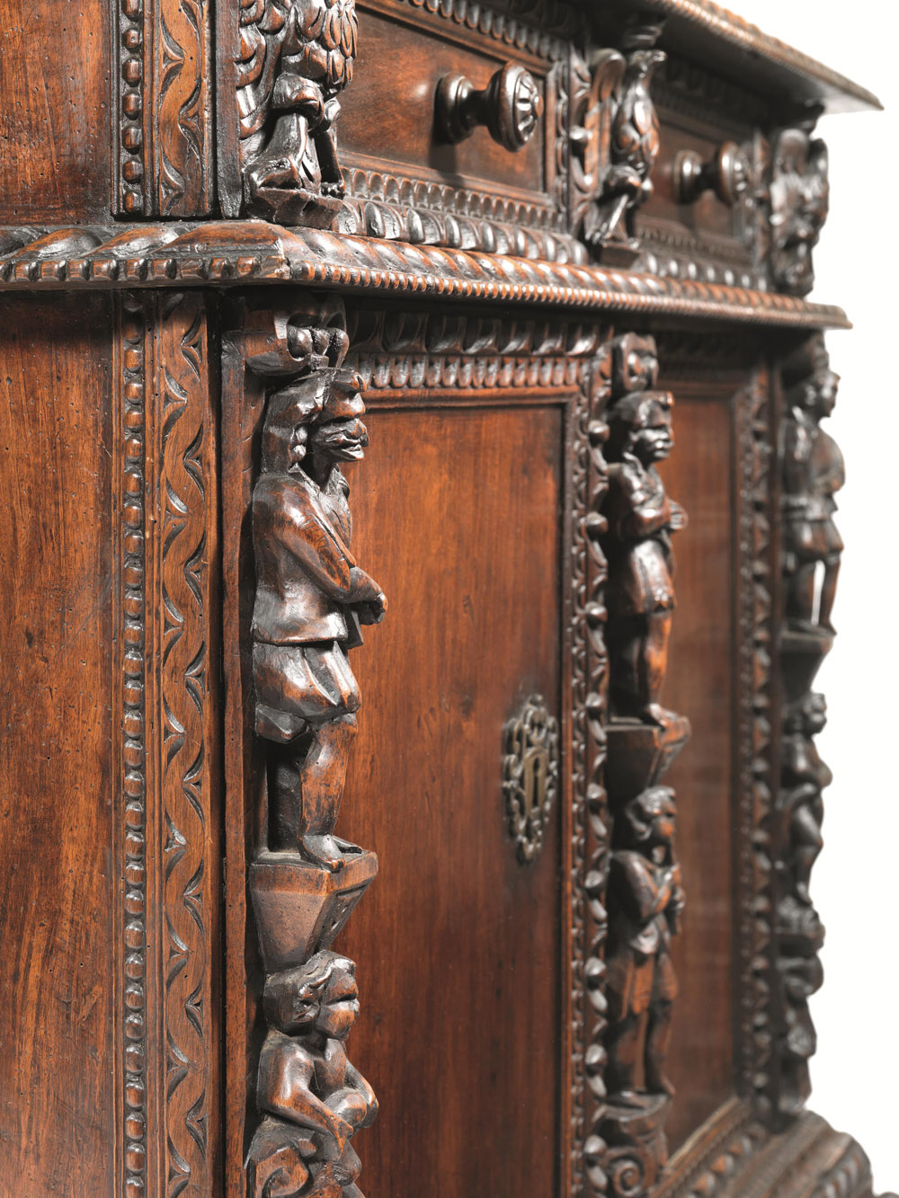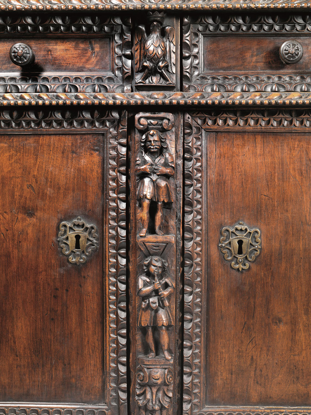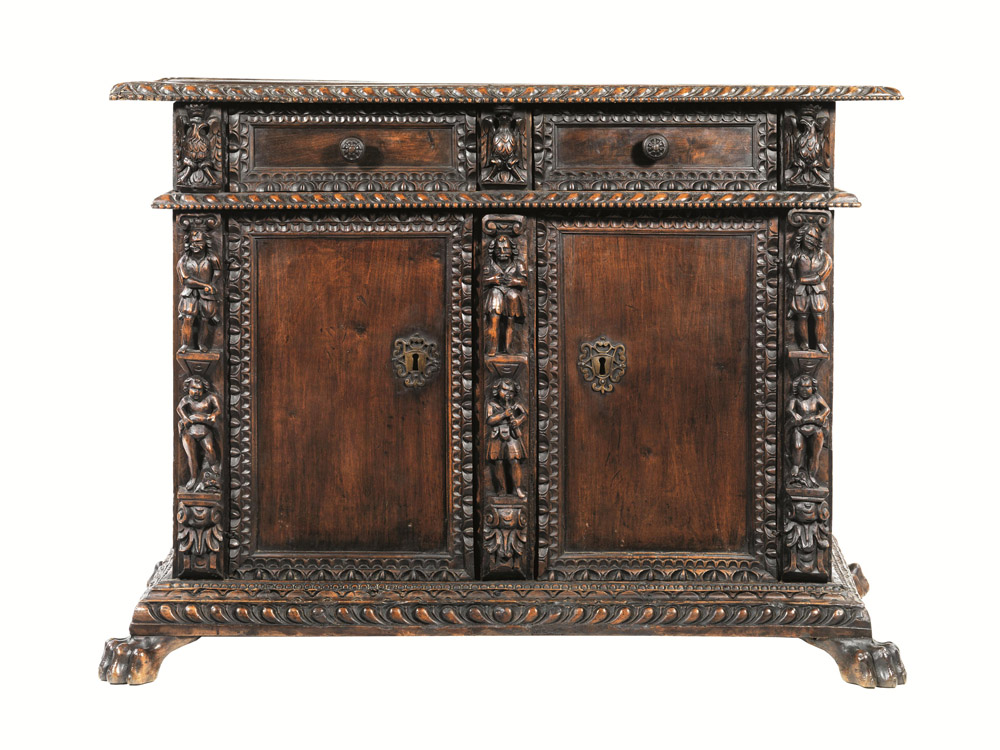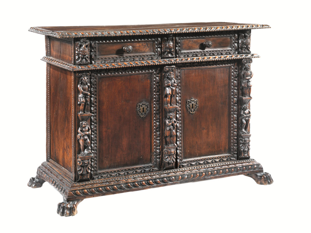 in noce a patina scura intagliato e scolpito; piano rettangolare con bordo baccellato, due cassetti appaiati nella fascia e due sportelli sottostanti con cornici riccamente scolpite a foglie stilizzate; lesene e fascia centrale scolpiti con figure in alto rilievo, base baccellata su piedi a zampa ferina, cm 104x137x53