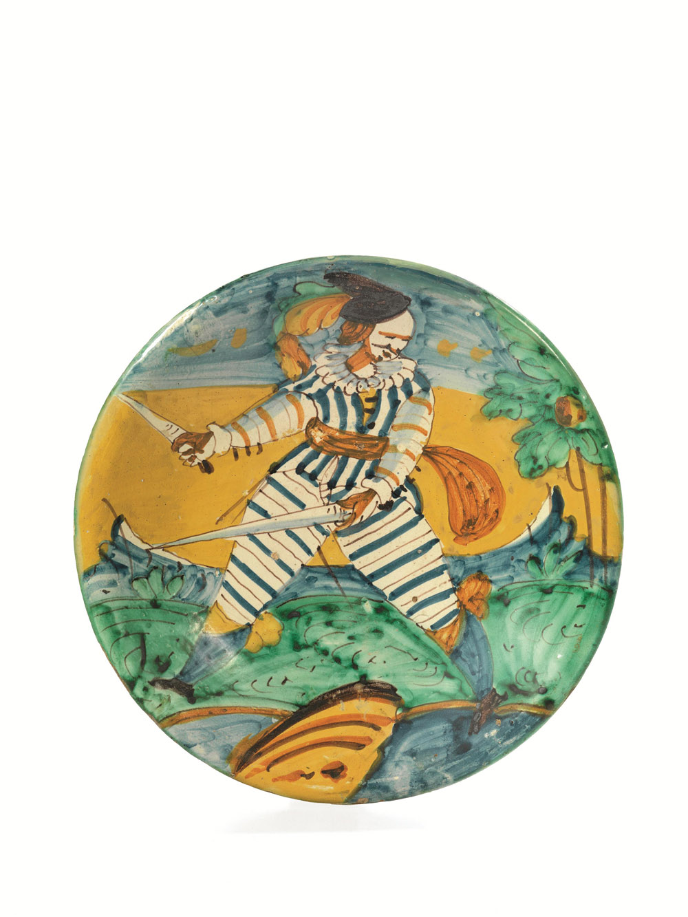 in maiolica decorata in policromia, di forma svasata con orlo arrotondato, poggiante su piede piano, non smaltato. Al centro spicca uno “spadaccino” armato di doppia spada, che indossa il caratteristico abito a righe, il capo coperto da un berretto piumato. Sullo sfondo un paesaggio a più piani prospettici, con monti e un alberello adorno di frutti sulla destra. Tali caratteristiche portano ad inserire il nostro piatto in quello che Carmen Ravanelli Guidotti ha individuato come Gruppo dei volti “spagnoli” , collocabile nel periodo 1640-1670; alt. cm 4,8, diam. cm 32,7, diam. piede cm 14