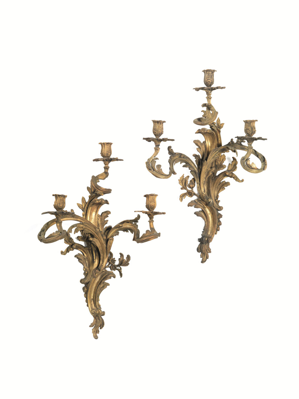 COPPIA DI APPLIQUES, FINE SECOLO XIX in bronzo dorato a tre luci, cartella...