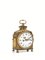 in bronzo dorato, cassa quadrangolare gradinata nella parte superiore, arricchita da festoni sul fronte e sul retro e da incisioni floreali sui lati; presa ripiegabile sagomata a serpente che si morde la coda; fianchi decorati da due grandi fregi floreali applicati, piedi a trottola. Sul retro sportello con lunetta e greca in bronzo dorato rivestita di seta verde. Quadrante in smalto bianco con numeri arabi, firmato Robert & Courvoisier , cm 23x13,5x12