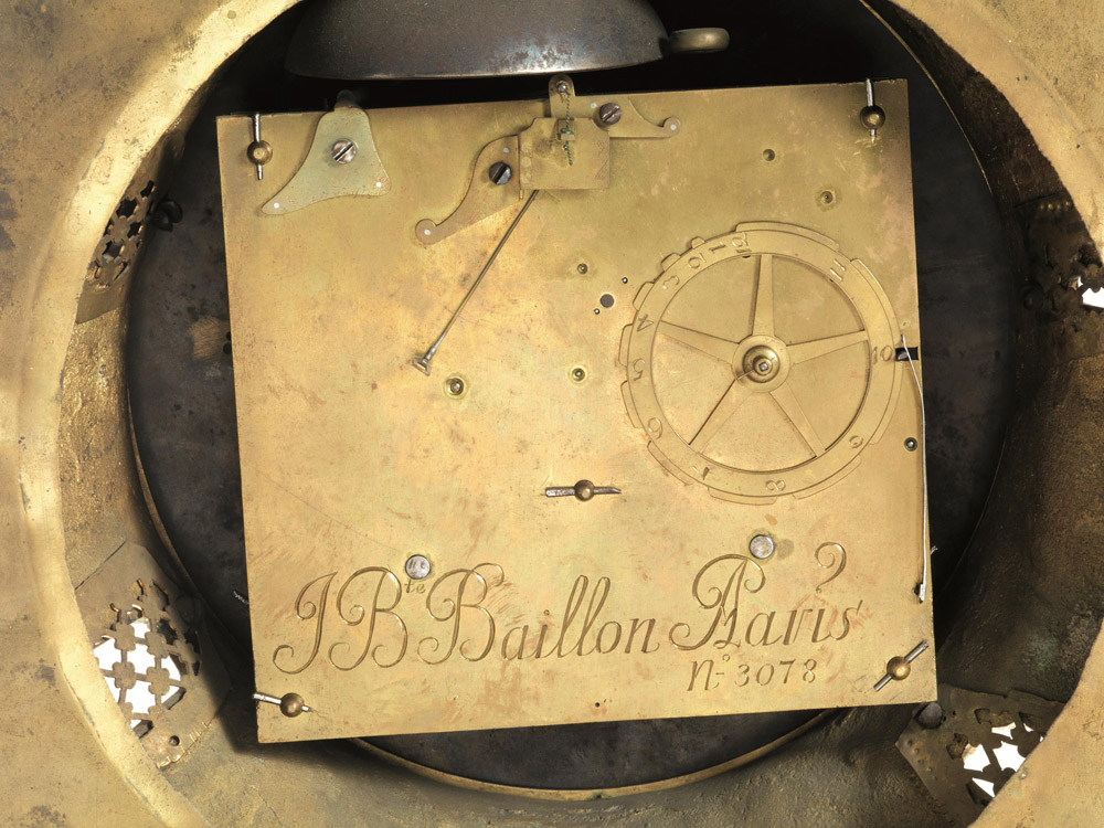 in bronzo cesellato e dorato, riccamente decorato a volute vegetali con inserti in bronzo traforato; quadrante in smalto bianco con numeri romani in blu per le ore e arabi in nero per i minuti, lancette e piccoli gigli tra le ore in bronzo dorato, firmato J. Baptiste Baillon ; meccanismo firmato J.B.te Baillon A Paris n. 3078 , cm 83x40