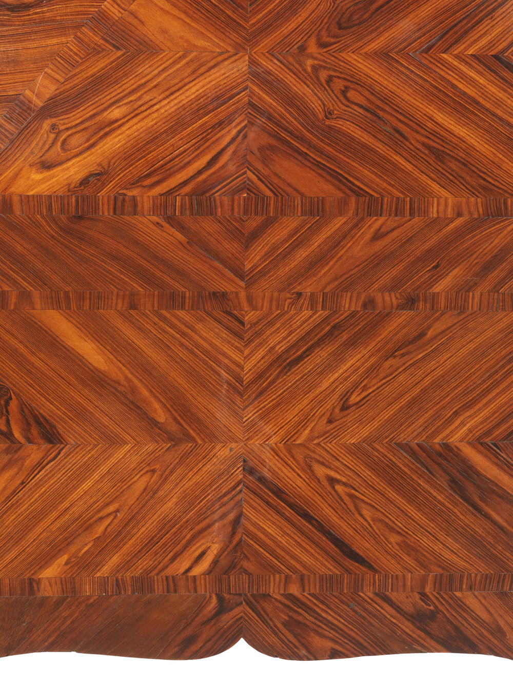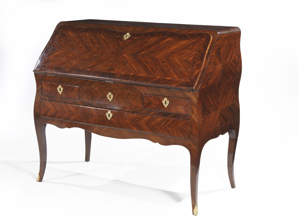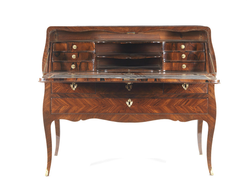 in noce impiallacciato in bois de violette ; ribalta sagomata celante sei cassettini su due file centrati da vano a giorno diviso in tre ripiani, sul fronte due piccoli cassetti appaiati e un altro cassetto sottostante, gambe a sciabola con applicazioni in bronzo dorato, cm 97x110x56