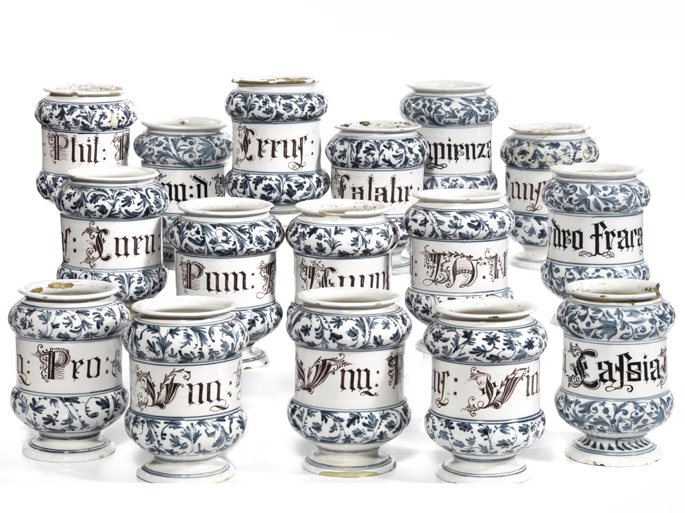 ASSORTIMENTO DI ALBARELLI DA FARMACIA, MANIFATTURA DELL’ ITALIA SETTENTRIONALE, INIZI DEL SECOLO XVIII