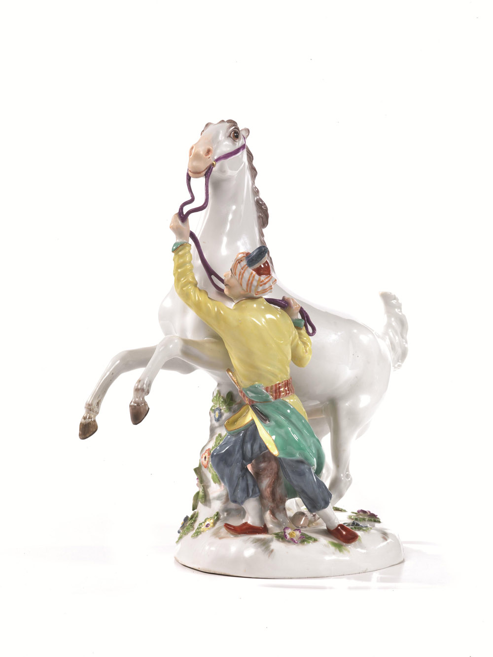in porcellana policroma raffigurante turco con cavallo bianco; base ovale decorata da fiorellini sulla quale poggiano il cavallo impennato e il personaggio che ne regge le briglie. Marca sul retro della base, iscrizione A.51 e numero 50 incisi nella pasta, numero 64 dipinto sul fondo, cm 26x24x12