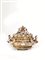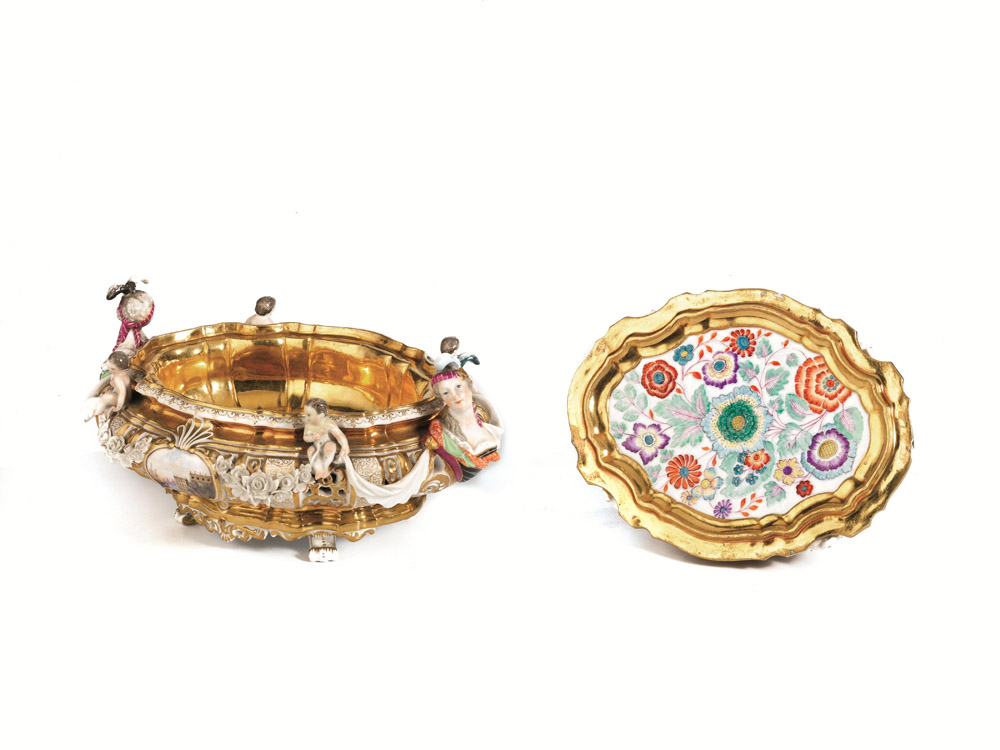 di forma ovale in porcellana policroma e dorata, realizzata secondo il servizio Krönung, coperchio sormontato da una corona sorretta da putti tra quattro cartigli, dei quali i più grandi sono dipinti con gli stemmi degli Elettori di Polonia e Sassonia, mentre sugli altri due sono raffigurate scene di caccia; sul corpo putti a tutto tondo che sorreggono drappi si alternano a riserve dipinte con scene paesaggistiche; le anse sono modellate in forma di busti di fanciulle abbigliate alla moda; interno del coperchio decorato in policromia a motivi floreali; piedini a ricciolo, cm 19x25x17