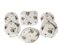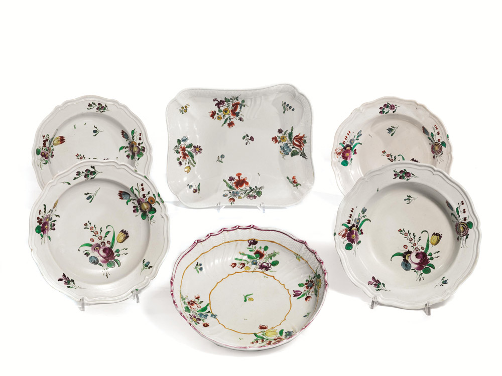 in porcellana bianca decorata in policromia a motivo del "mazzetto", composto da quattro piatti fondi, un vassoio rettangolare ed un’insalatiera, diam. piatti cm 23, vassoio cm 29x23,5, diam. ciotola cm 23,5