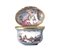 in porcellana policroma montata in oro e pietre preziose decorata con scene galanti incorniciate da motivo a scaglie in azzurro; all''interno del coperchio, miniatura raffigurante gentildonna che ricama, cm 6x8x5,5
