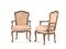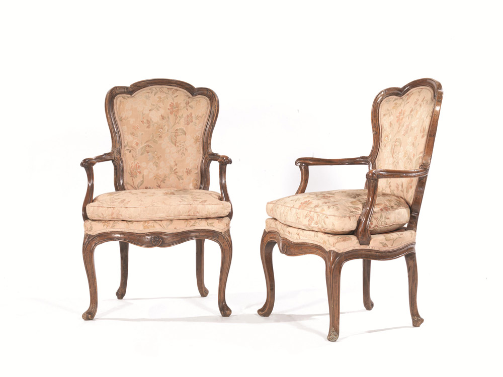 in noce, schienale dal profilo sagomato, braccioli mossi terminanti in riccioli, grembiali arcuati centrati da corolla e bordati da filettature sinuose rilevate che proseguono nelle gambe, mosse con piedini a ricciolo; schienale e seduta rivestiti in seta rosa decorata a fiori, alt. cm 92 (2)