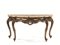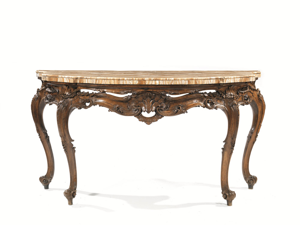 in noce in stile veneziano del Settecento; piano sagomato in onice, sostegno interamente mosso intagliato nei grembiali in parte traforati con conchiglie, fogliame e un susseguirsi di volute, gambe arcuate terminanti in ricciolo ed intagliate con costolature e motivi rocaille , cm 94x175x72,5