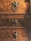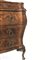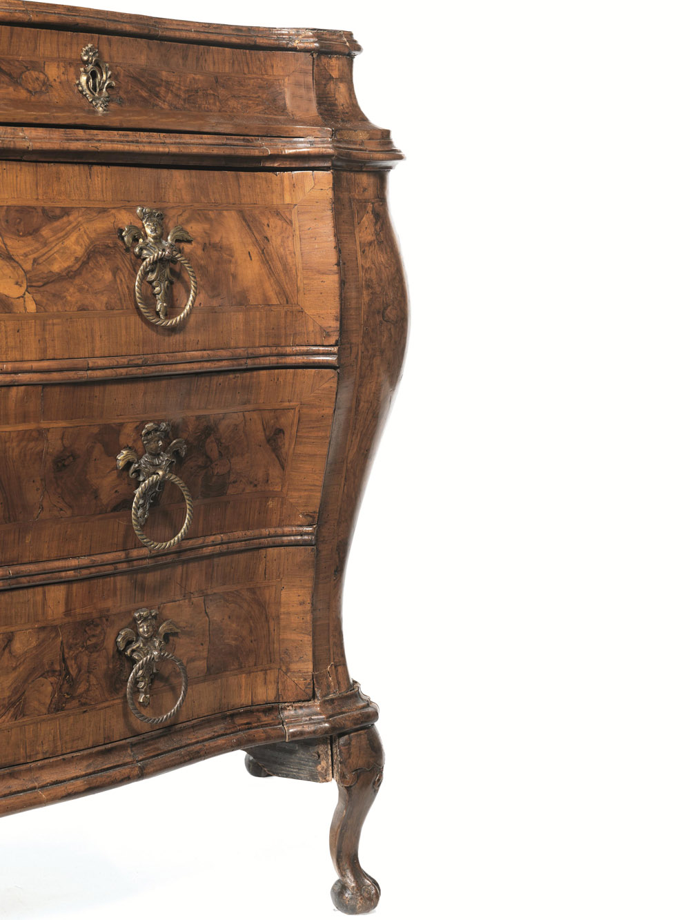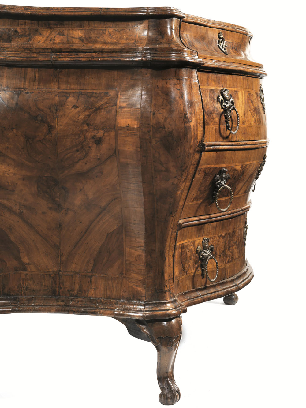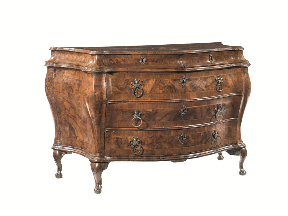 in noce e radica di noce, fronte e fianchi mossi, cinque cassetti di cui due più piccoli nella fascia a gola sotto il piano sagomato e bordato da doppia cornice, intarsiato con filettature formanti riserve; gambe mosse intagliate alla sommità da piccole volute e campanule pendenti, piedi a sfera artigliata, cm 89,5x144x70