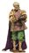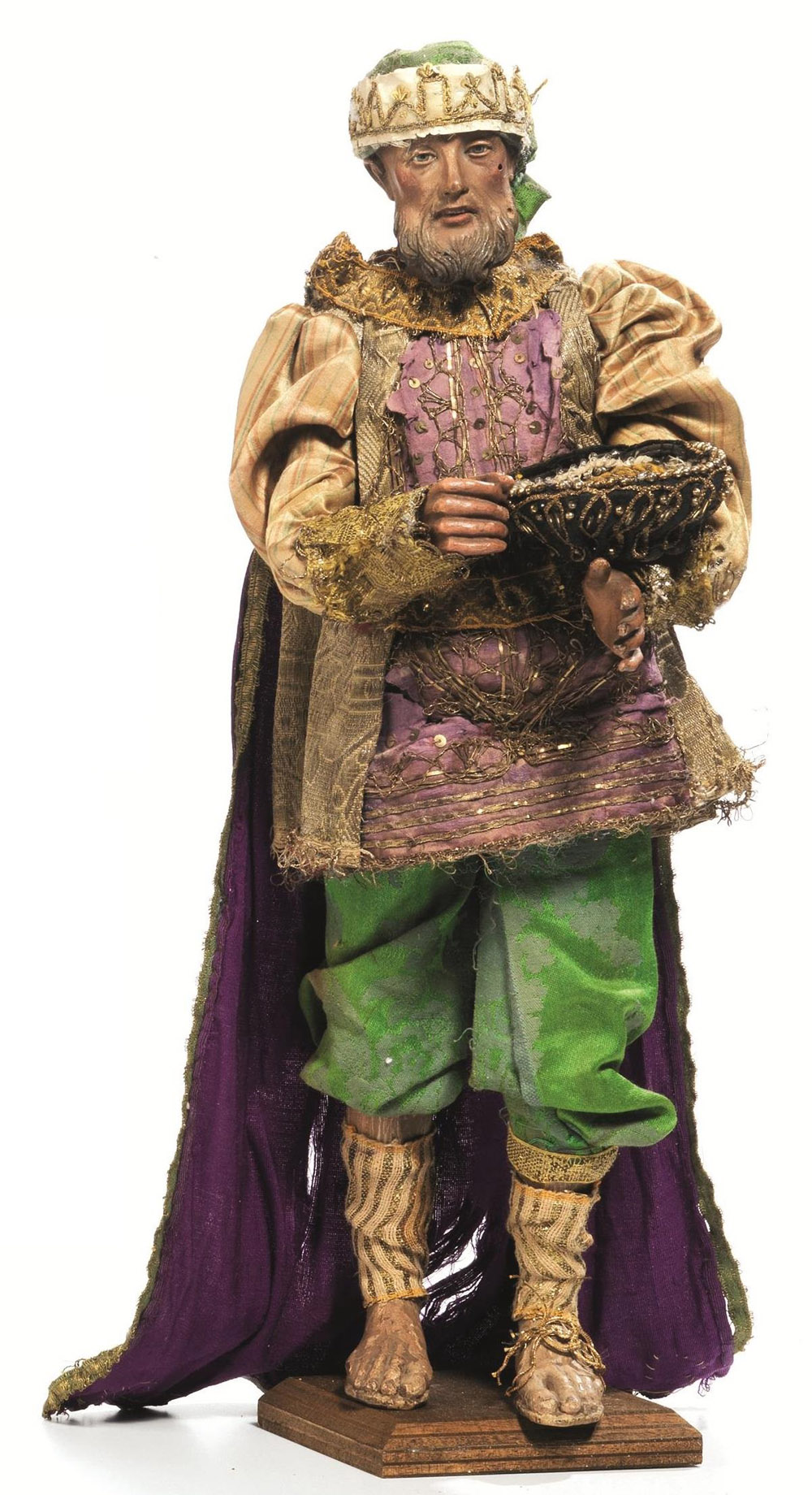 testa, mani e piedi in legno dipinto, occhi in vetro, manichino in fil di ferro ricoperto di stoppa. Vestitura: brache in seta verde operata, casacca in seta viola e beige con ricami dorati, manto viola con galloni in oro. Accessori: cesta ricamata in oro e impreziosita da perline, turbante in seta verde, alt. cm 41