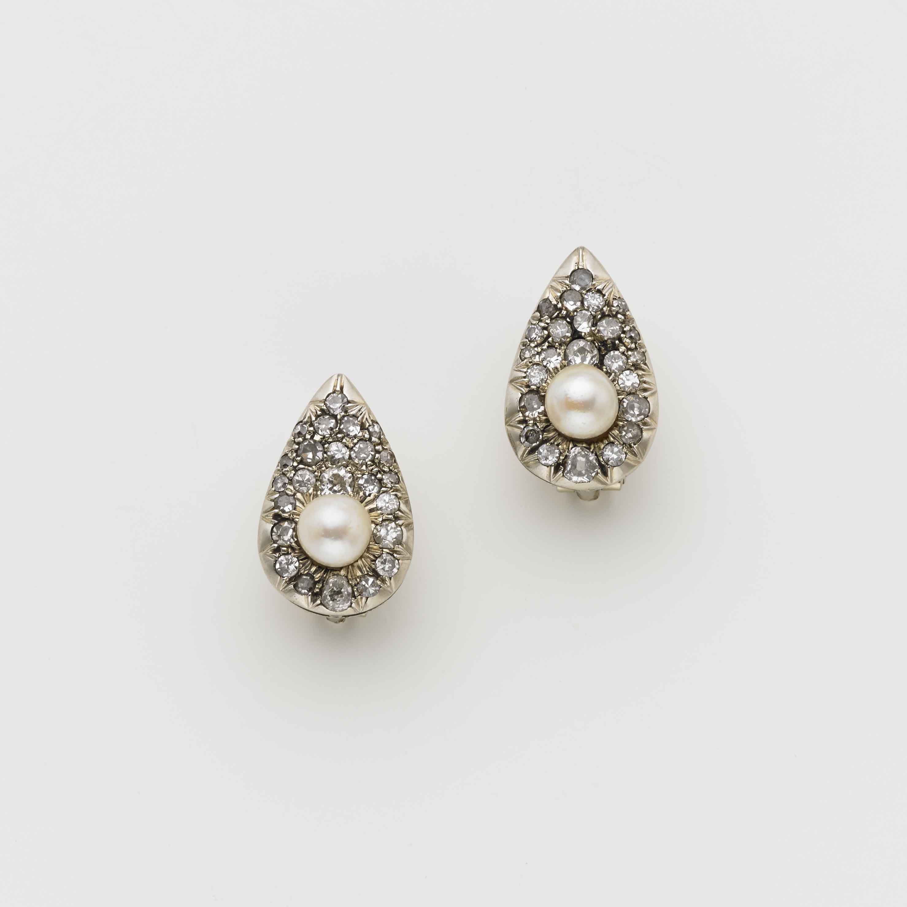 Orecchini a lobo con clips in oro bianco a forma di goccia, diamanti a pavé e due perle, g. 6,7 White gold drop earrings with diamonds and two pearls