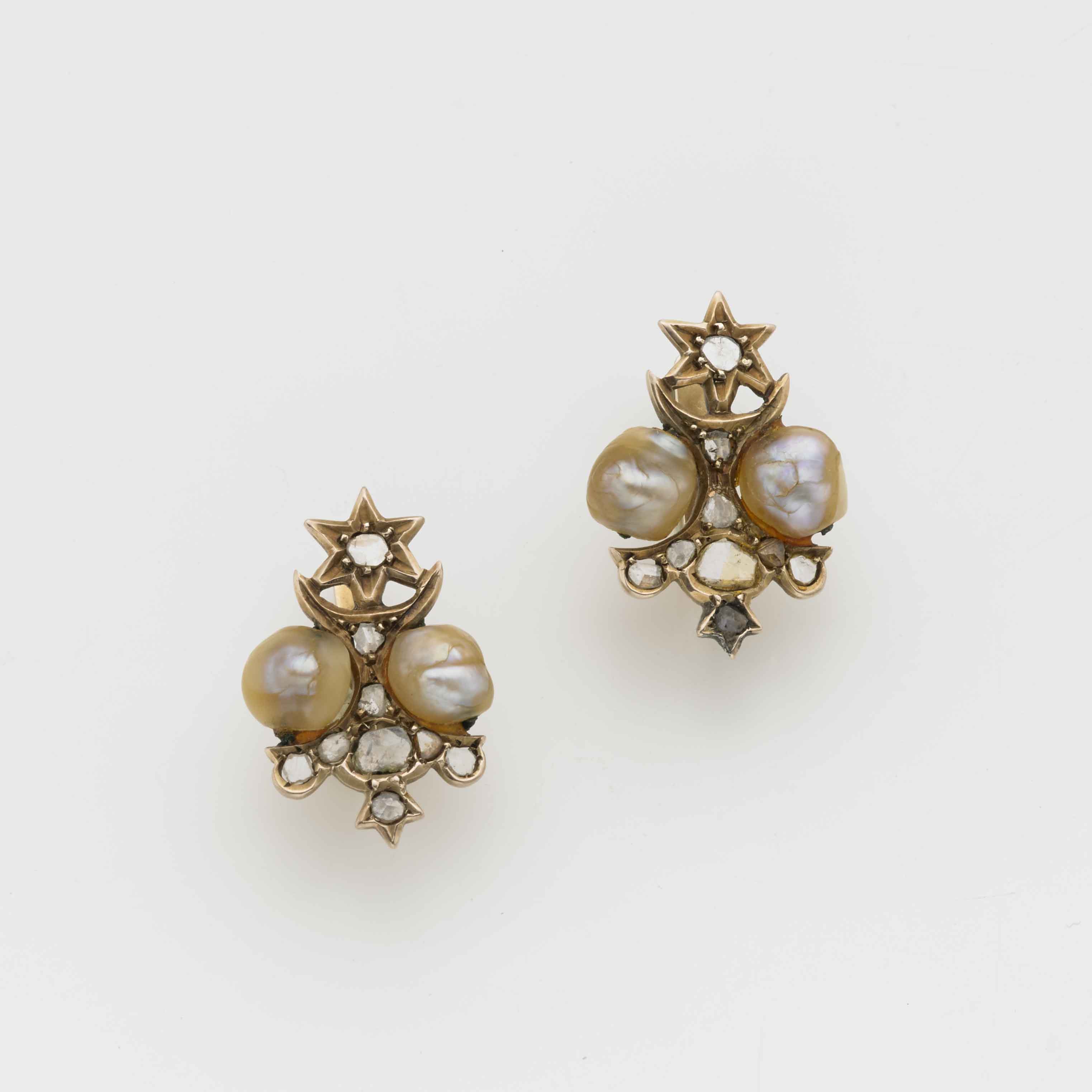 Orecchini in oro rosso e giallo con diamanti taglio mezza rosetta e quattro perle, g.5,60 Red and yellow gold earrings with diamonds and four pearls