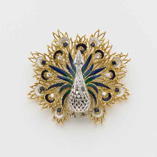 Spilla a forma di pavone in oro bianco e giallo con diamanti rotondi, zaffiri rotondi e smalti guillochè g.42,70 White and yellow gold brooch with diamonds, sapphires, and guilloché enamels