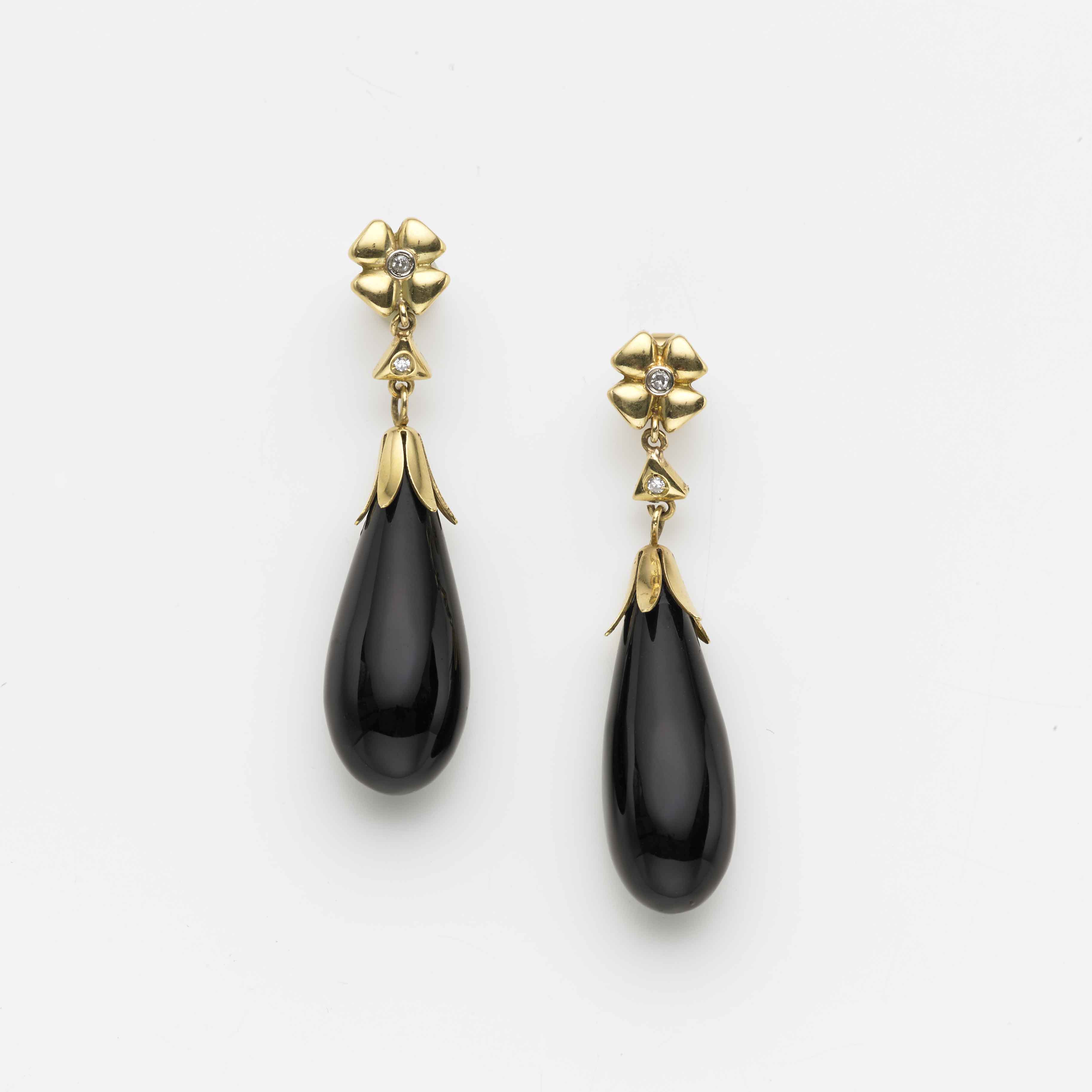 Orecchini pendenti in oro giallo con al lobo due quadrifogli centrati da due diamanti come nei triangoli a snodare due goccie di onice, g.14,30 Onyx and diamond gold pendant earings