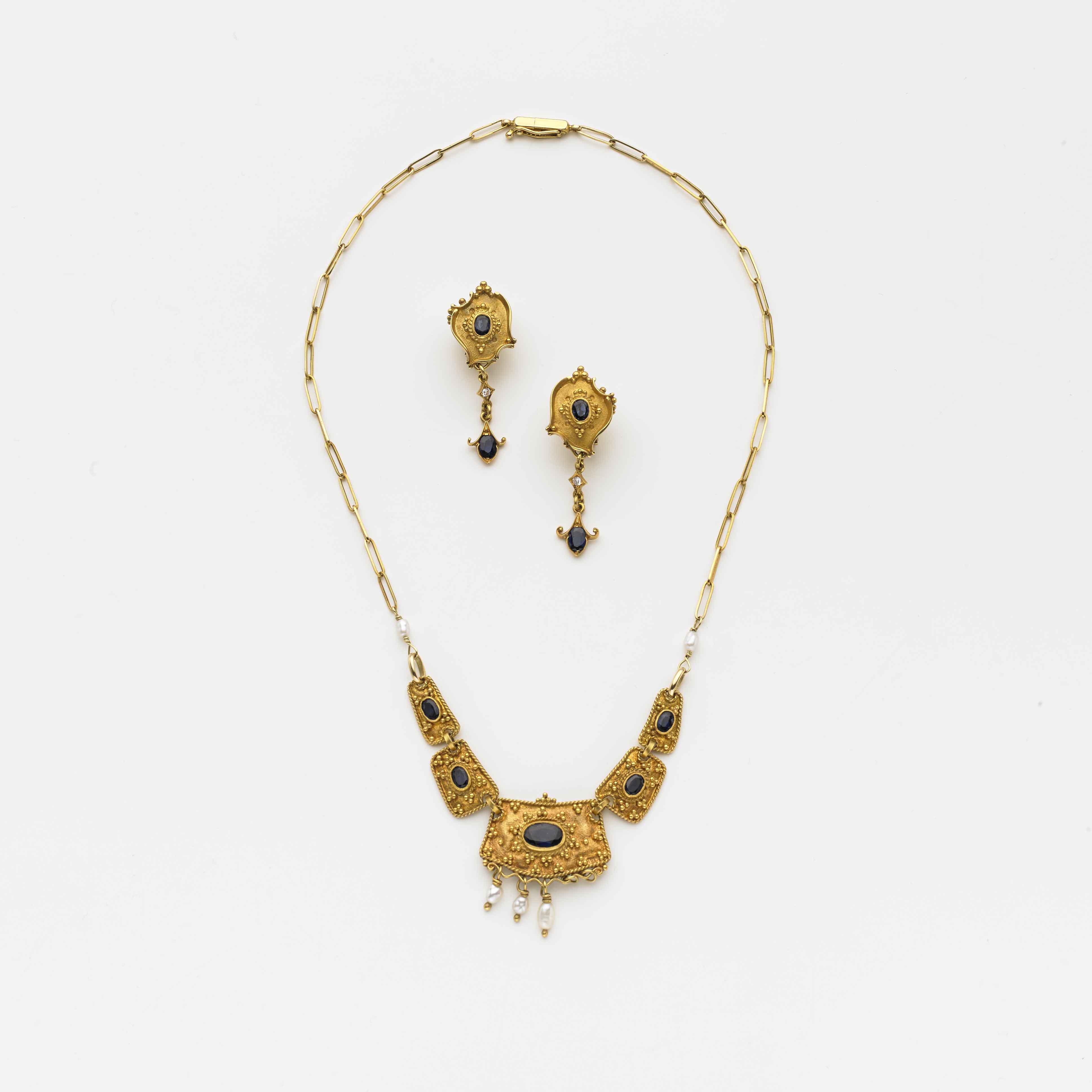Lot 51 | Demi-parure: collier ed orecchini in oro giallo con zaffiri ovali e perle. g....