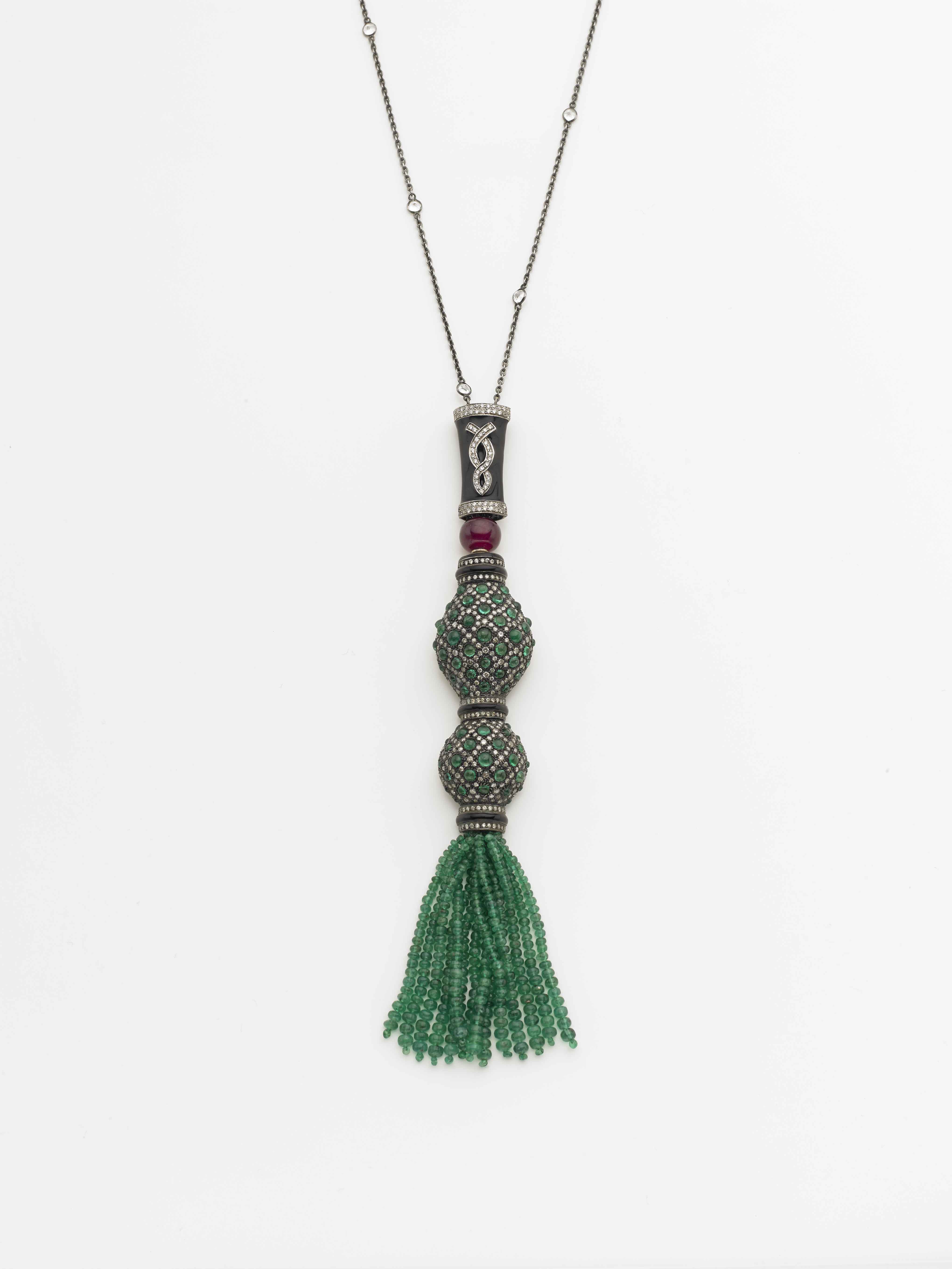Sautoir in argento e argento dorato con pendente in diamanti smeraldi come la nappa finale smalti neri e paste vitree Silver necklace with diamond and emerald pendant and terminal tassel with black enamels
