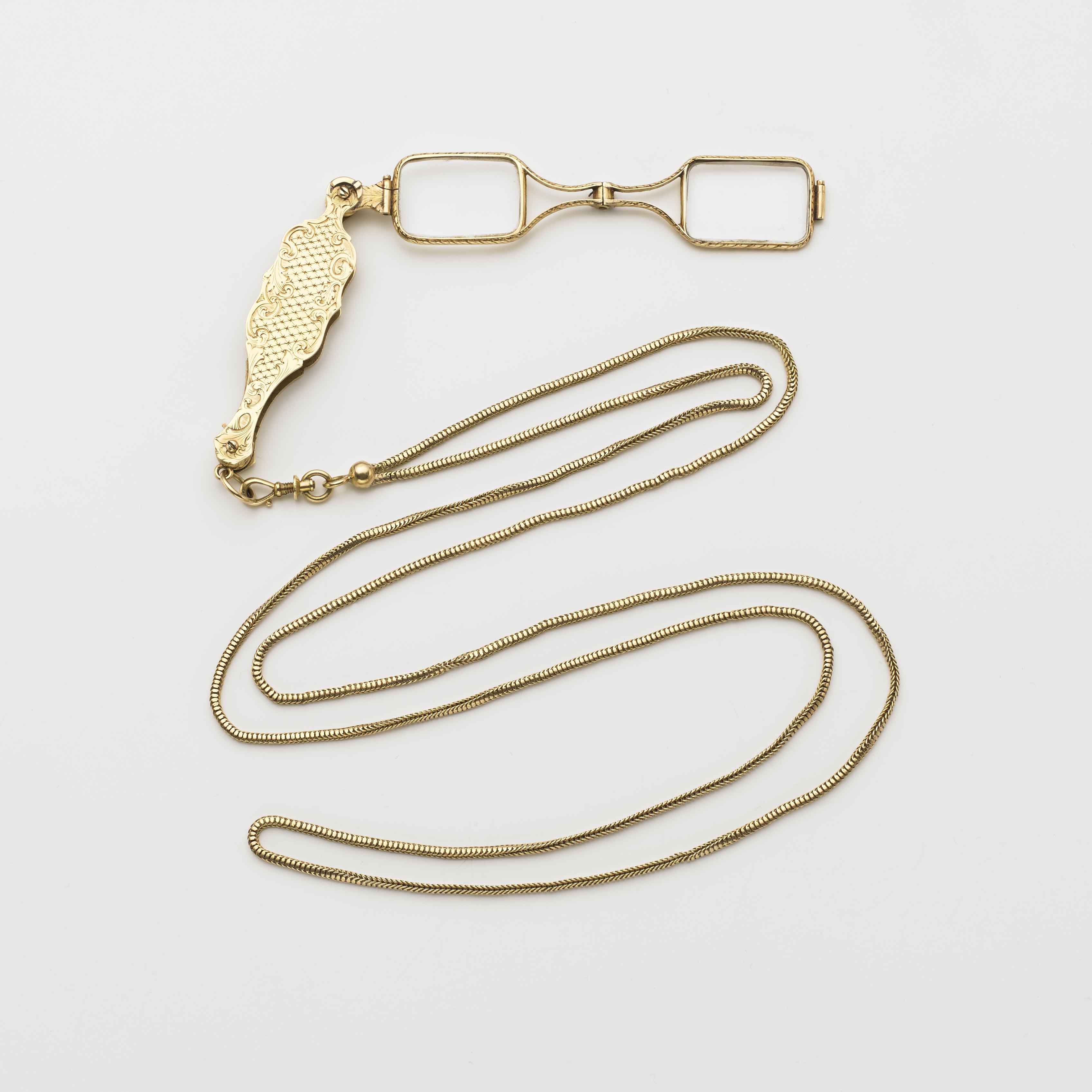 LORGNETTE Occhialini da teatro ripieghevole in oro giallo con impugnatura a stanghetta, e catena g.42 Anni seconda metà 1800 ca. Folding lorgnette with chain, circa the second half of the 19th century