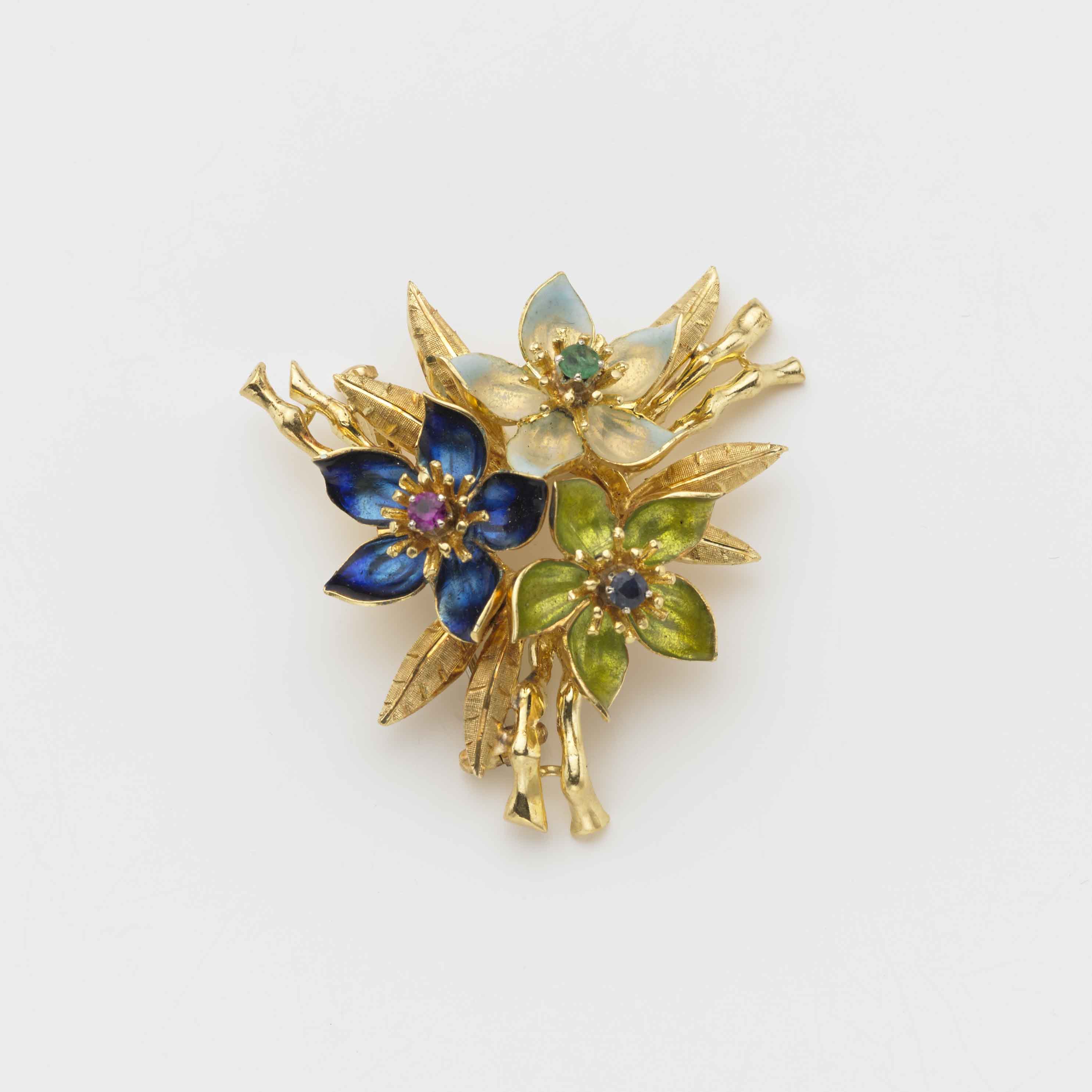 Spilla in oro giallo a guisa di fiori con smalti color blu verde e opale, uno zaffiro, un rubino e smeraldi tondi al centro dei fiori g. 11,20 Gold brooch with blue, green, and opal enamels and central sapphire, ruby, and emerald