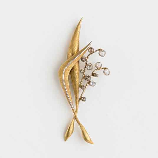 Lot 106 | Spilla in oro giallo e bianco a guisa di mughetto con diamanti irregolari...