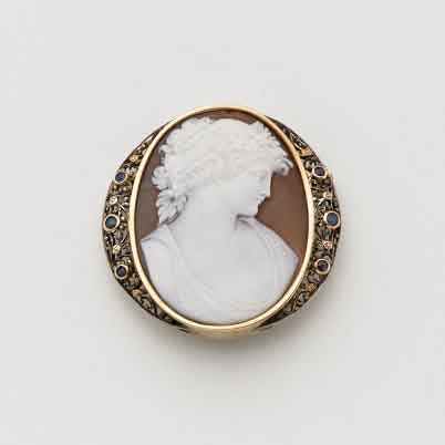Cammeo ovale su oro giallo e argento con sei piccoli zaffiri rotondi a scalare, g.12,60 Oval cameo on gold and silver base with sapphires