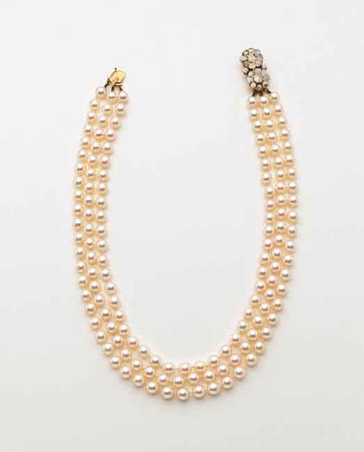 Collana a tre fili di perle coltivate Akoya bianco/rosate di mm 7/7,50 primo filo interno a 43 cm e chiusura in oro giallo e rosso con diamanti taglio mezza rossetta a formare due fiori Three-strand cultured Akoya pearl necklace with yellow and red gold clasp with diamonds