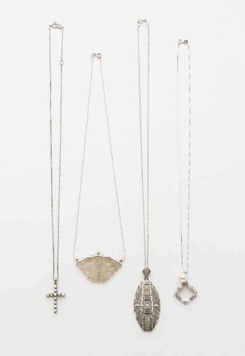 Lotto composto da quattro catenine con ciondoli vari, delle quali una è in platino, nei ciondoli una giada incisa, una perla coltivata e diamanti, complessivi g. 21,60 Lot comprising four chains, including a platinum one, with pendants