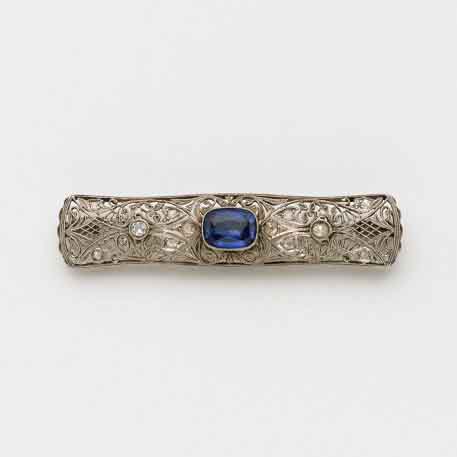 Spilla liberty in oro bianco con diamanti ed al centro uno zaffiro ovale...