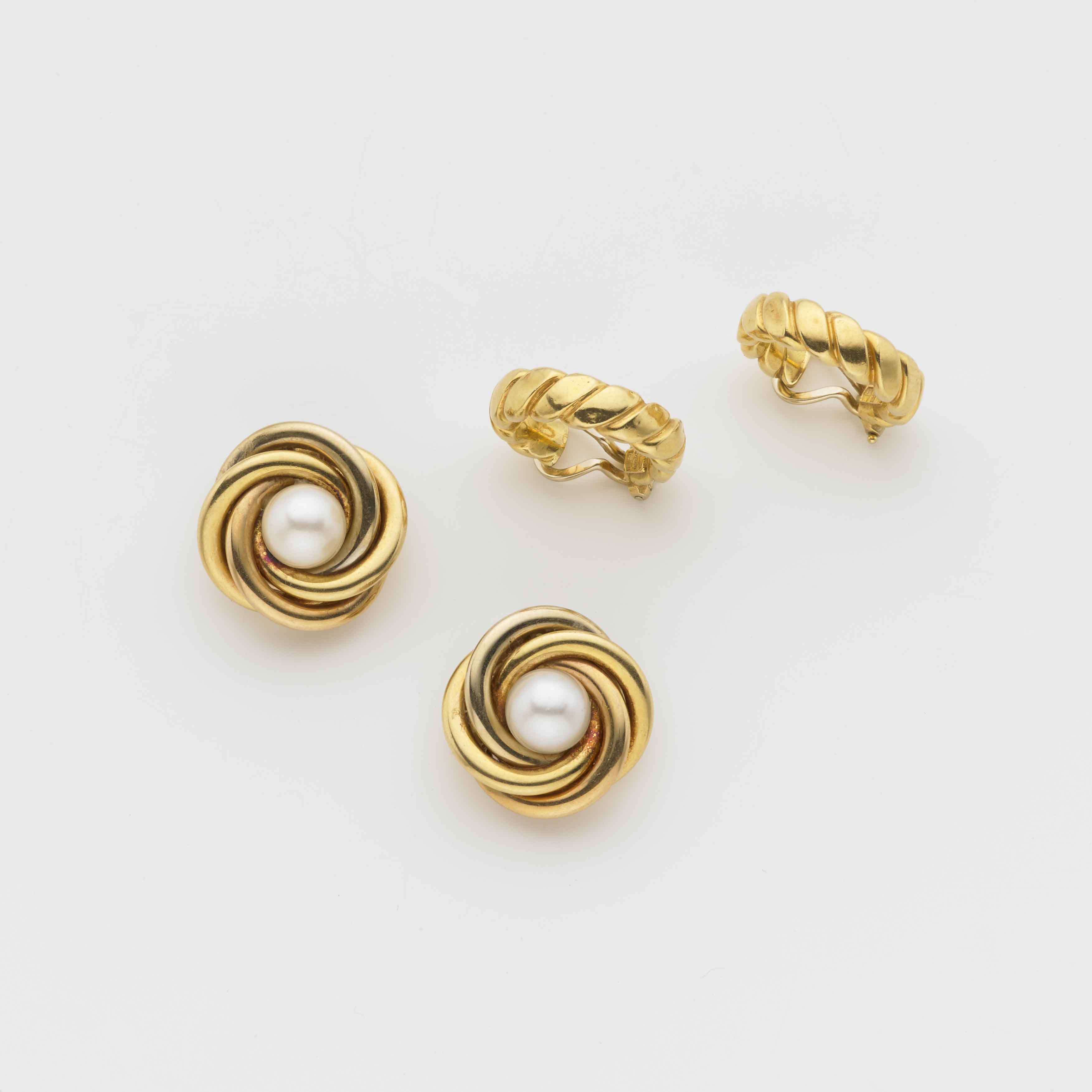 WEINGRILL Lotto composto da due paia di orecchini, uno a lobo in oro bianco giallo e rosso con perla centrale coltivata bianca e l'atro a cerchio in oro giallo attorcigliato entrambi di Weingrill g. 25 complessivi (lievi difetti) WEINGRILL Lot comprising two pairs of earrings: one in white, yellow, and red gold with central cultured pearl, the other in gold