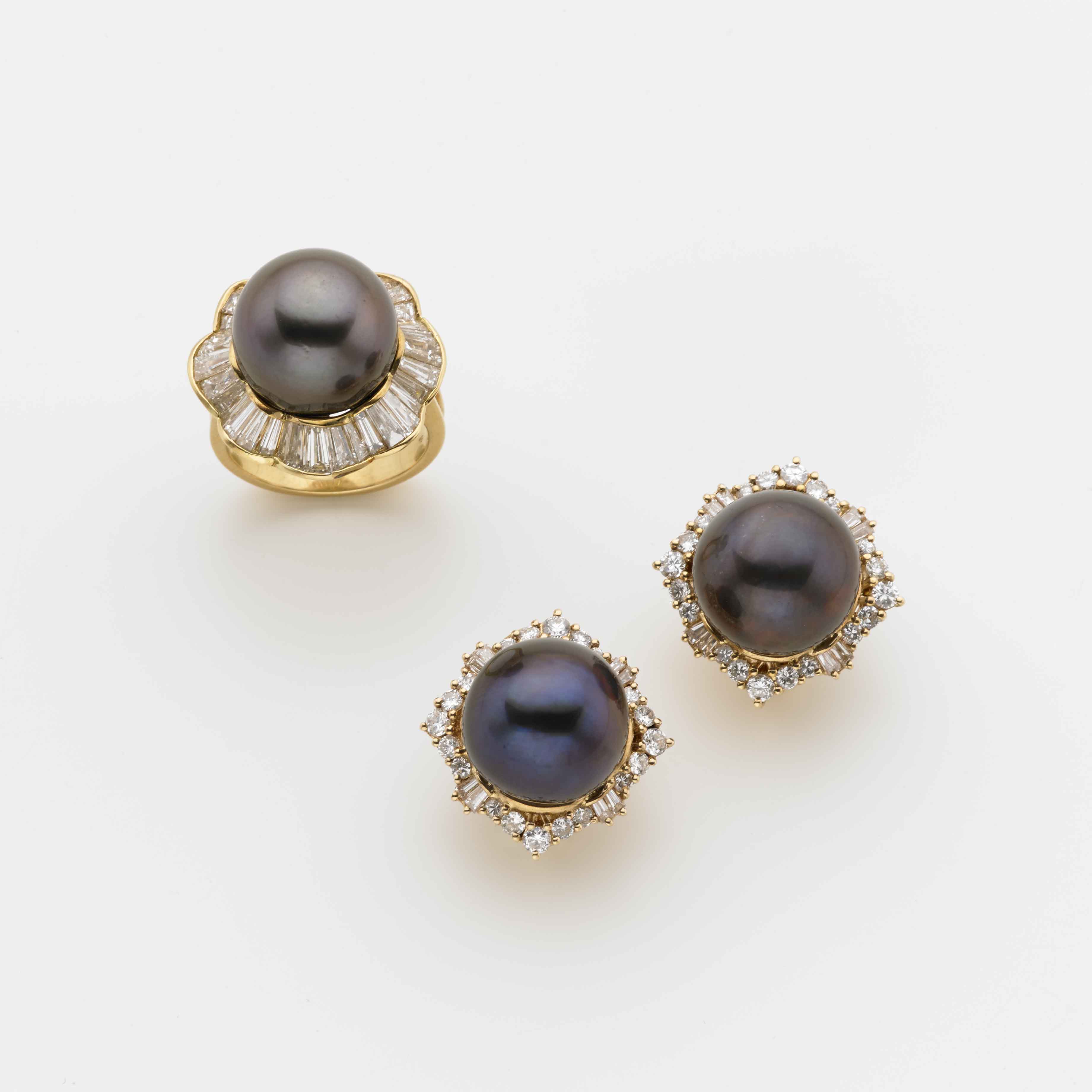 Demi-parure formata da anello in oro giallo 750/1000 e orecchini in oro giallo 585/1000 con diamanti tapered e rotondi taglio a brillanti con perle Tahiti di mm 14 circa, complessivi g. 29,40 Demi-parure comprising a 750/1000 gold ring and 585/1000 gold earrings with diamonds and Tahiti pearls