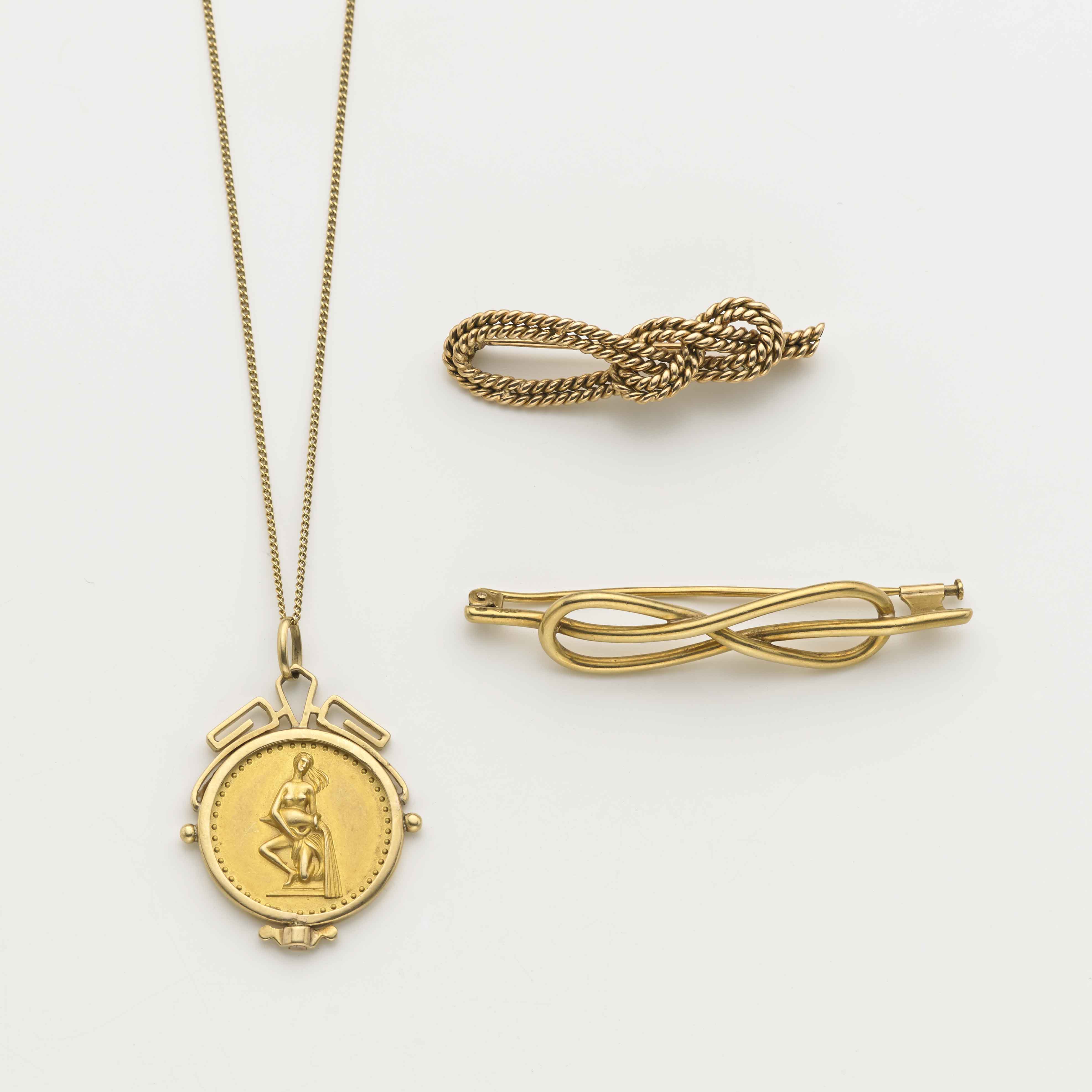Lotto in oro giallo composto da due spille a nodo e una medaglia con catenella, g.26,70 Gold lot comprising two brooches and a medallion with chain