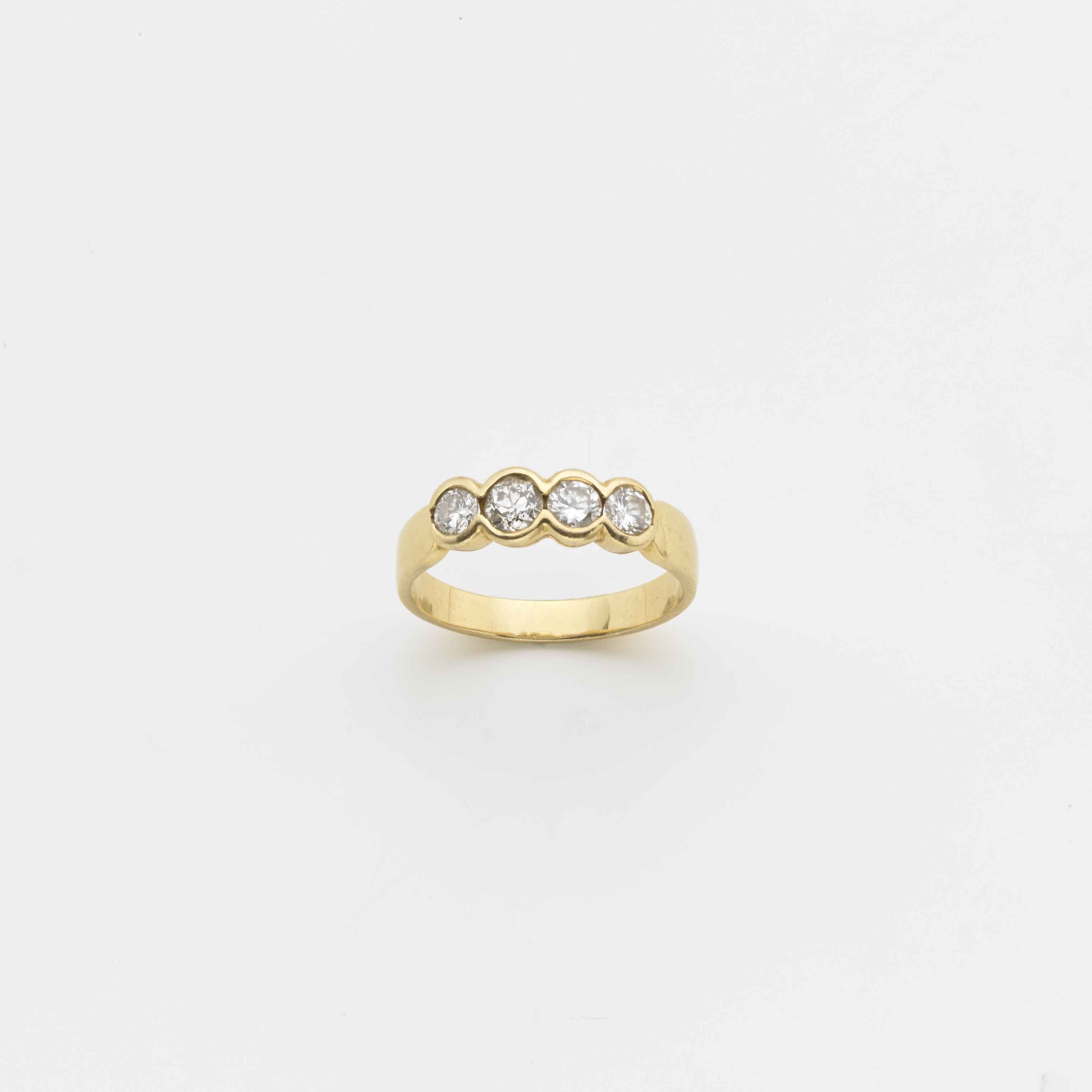 Fedina in oro giallo con quattro diamanti rotondi di cui tre taglio a brillante moderno europeo e uno vecchio europeo, g. complessivi 4,30, misura 19/59 Gold and diamond eternity ring