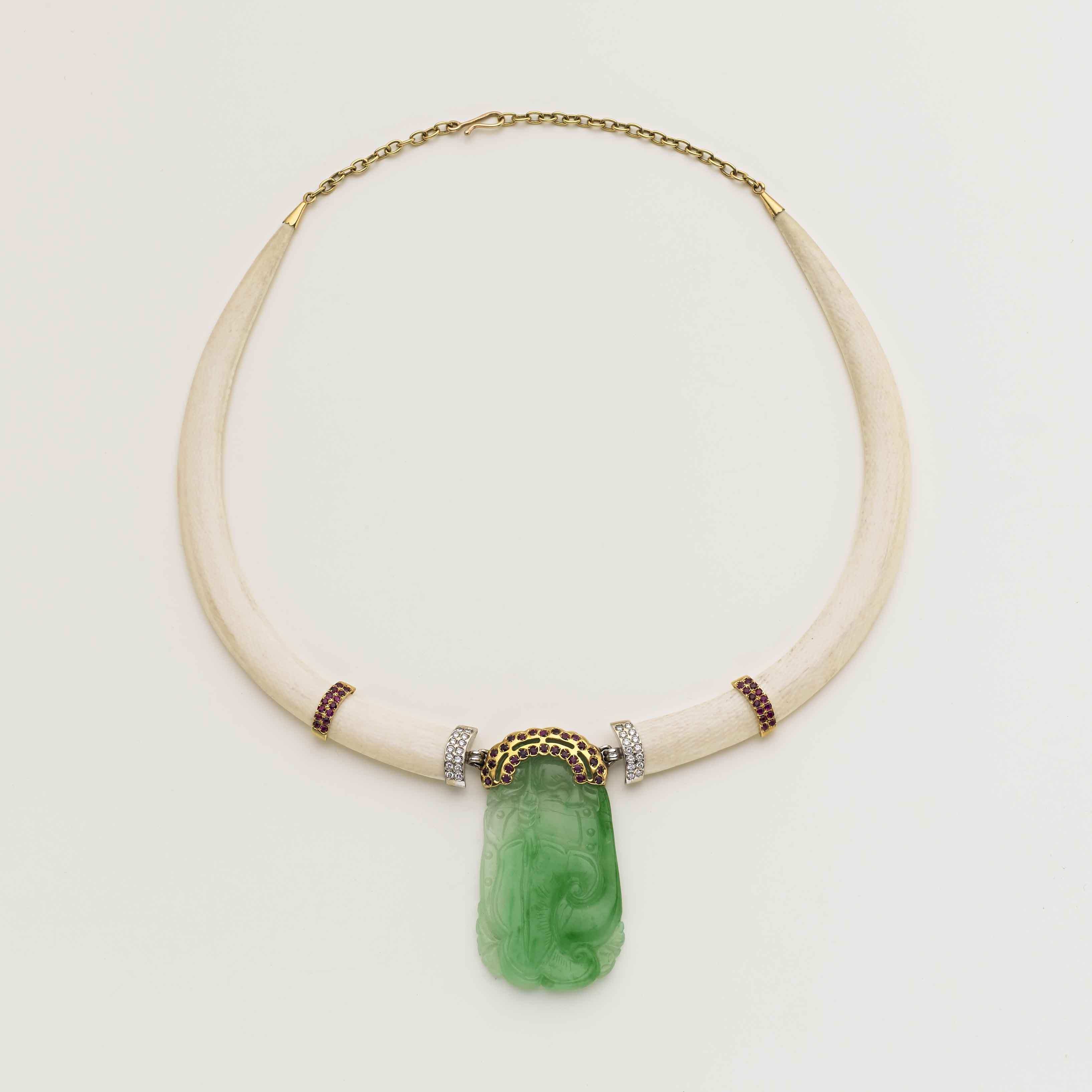 Collier in avorio con al centro una giadeite scolpita le rifiniture in oro bianco e giallo con rubini e diamanti complessivi g. 43,50 Ivory necklace with central sculpted jadeite, white and yellow gold trimmings, rubies, and diamonds