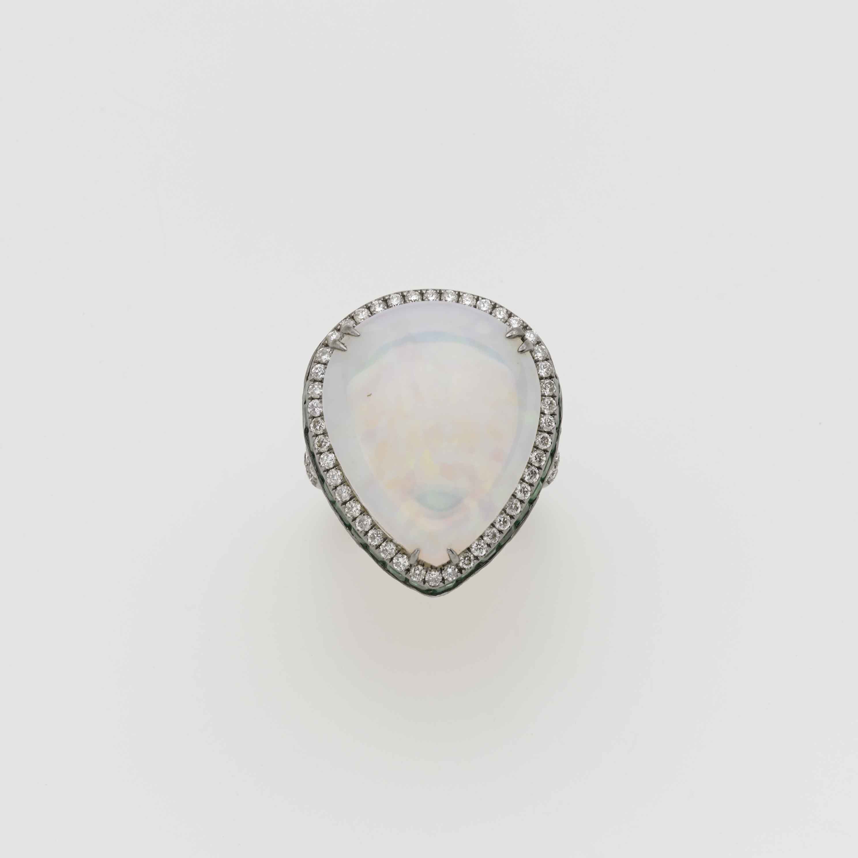 Anello in oro bianco con diamanti rotondi taglio brillante per ct 1 circa, e smaraldi carrè a contornare un opale a goccia g. 12,40 misura 15/55 White gold ring with diamonds, emeralds, and an opal drop