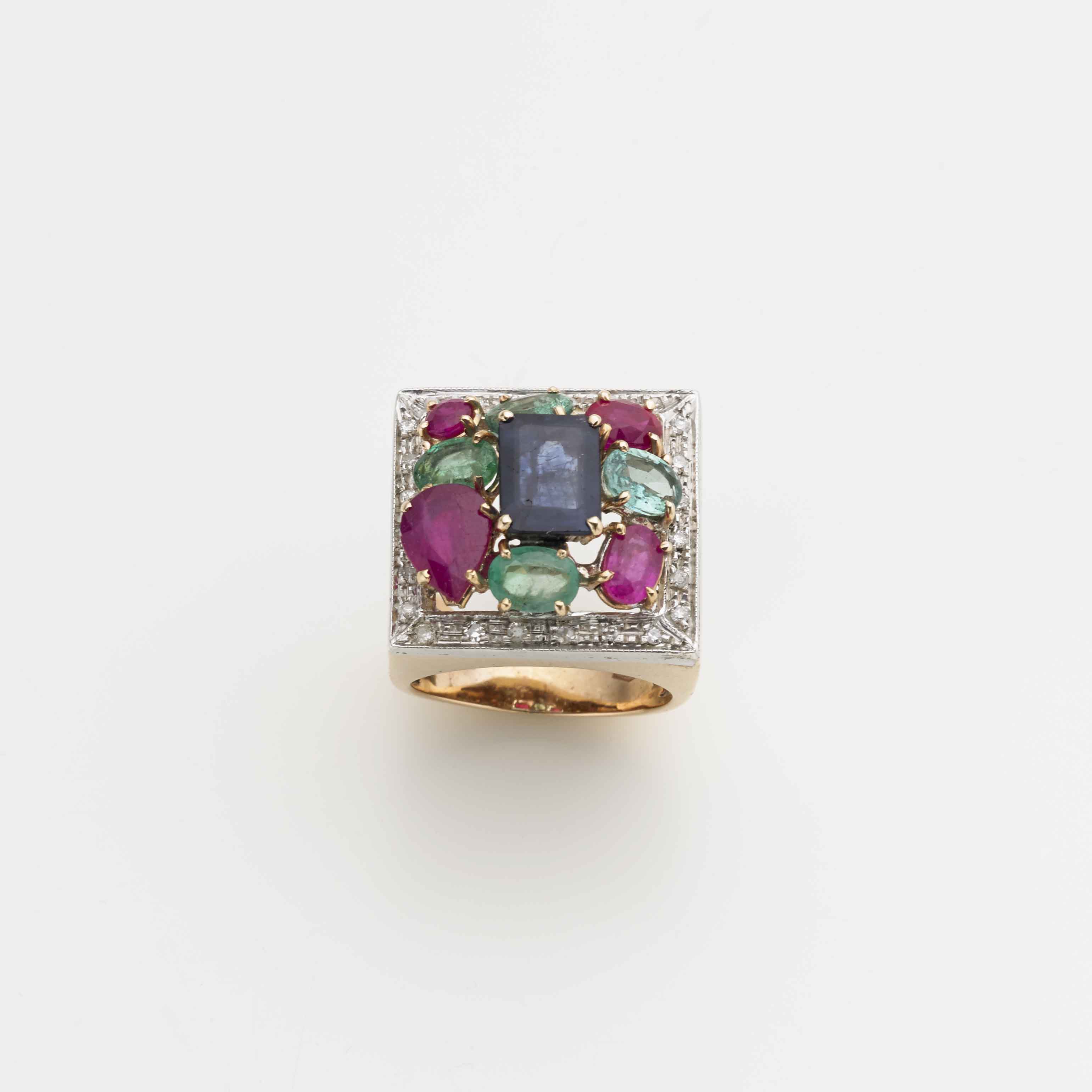 Anello squadrato in argento dorato con diamanti rotondi, zaffiri, smeraldi e rubini g. 14,30 misura 17/57 Silver-gilt ring with diamonds, sapphires, emeralds, and rubies