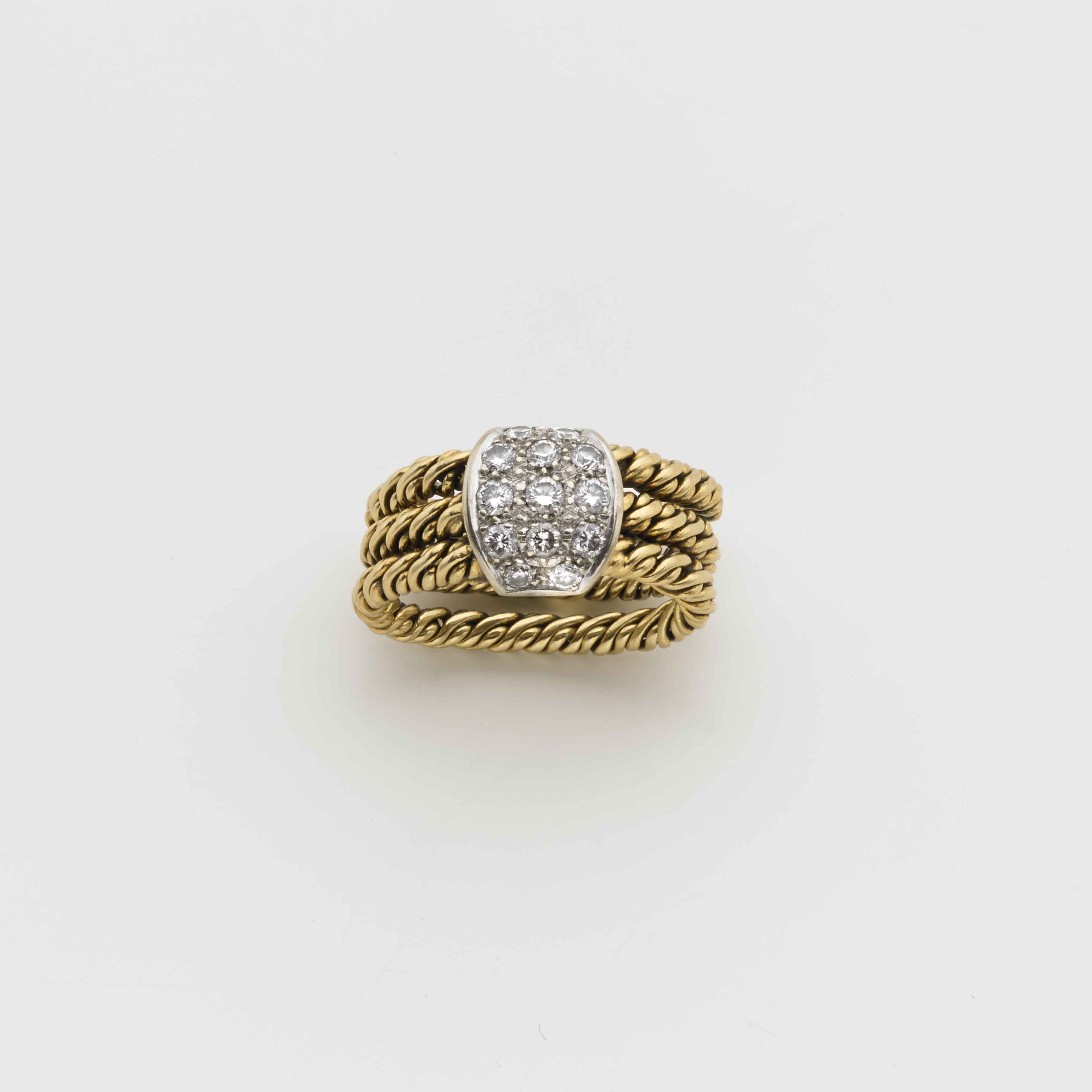 POMELLATO Anello a tre giri in oro giallo attorcigliato con al centro un pavè di diamanti rotondi, taglio a brillante, misura 16-17/56-57, g. 13,70 POMELLATO Triple gold ring with central diamond pavé