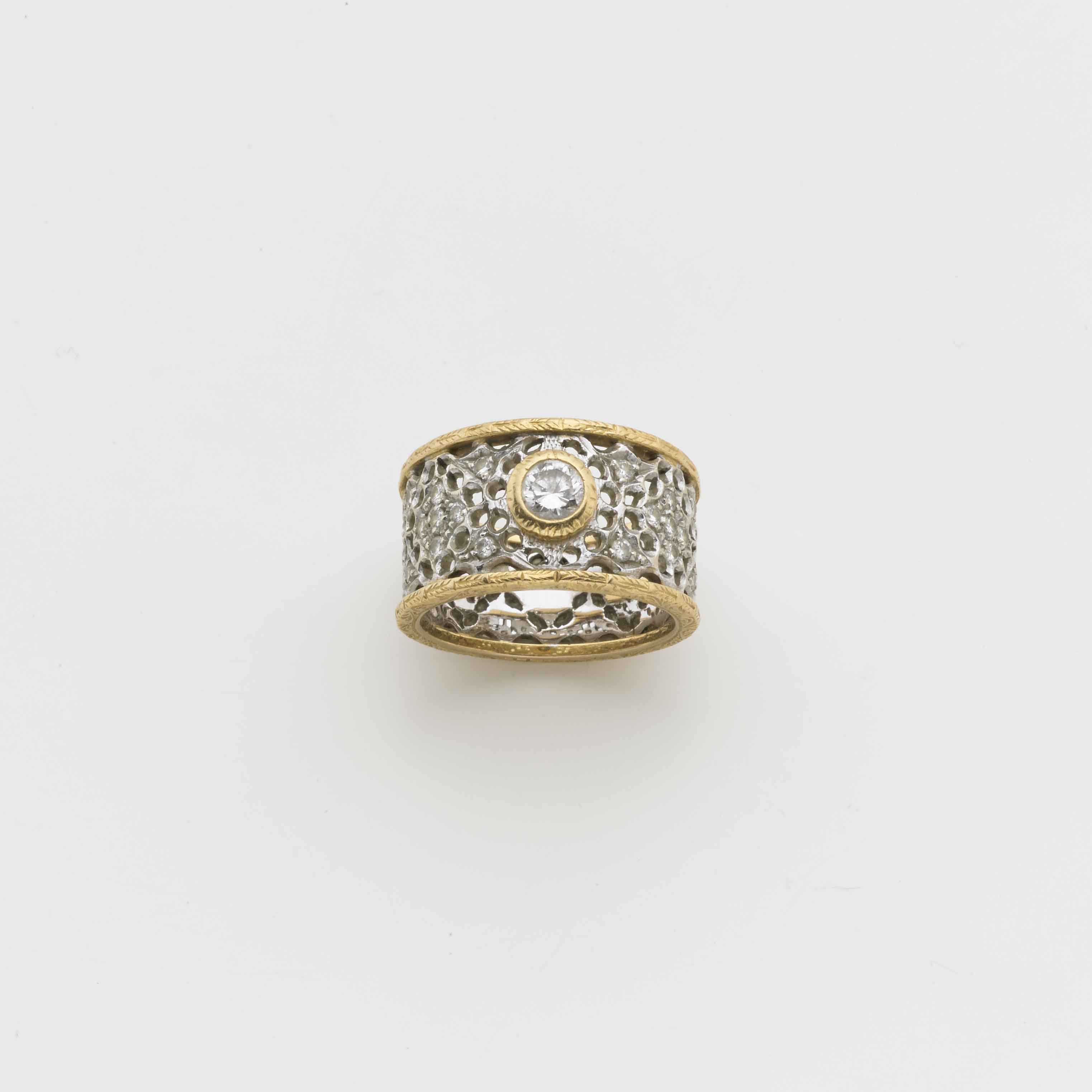 Anello in oro bianco e giallo, lavorazione a traforo con al centro un...