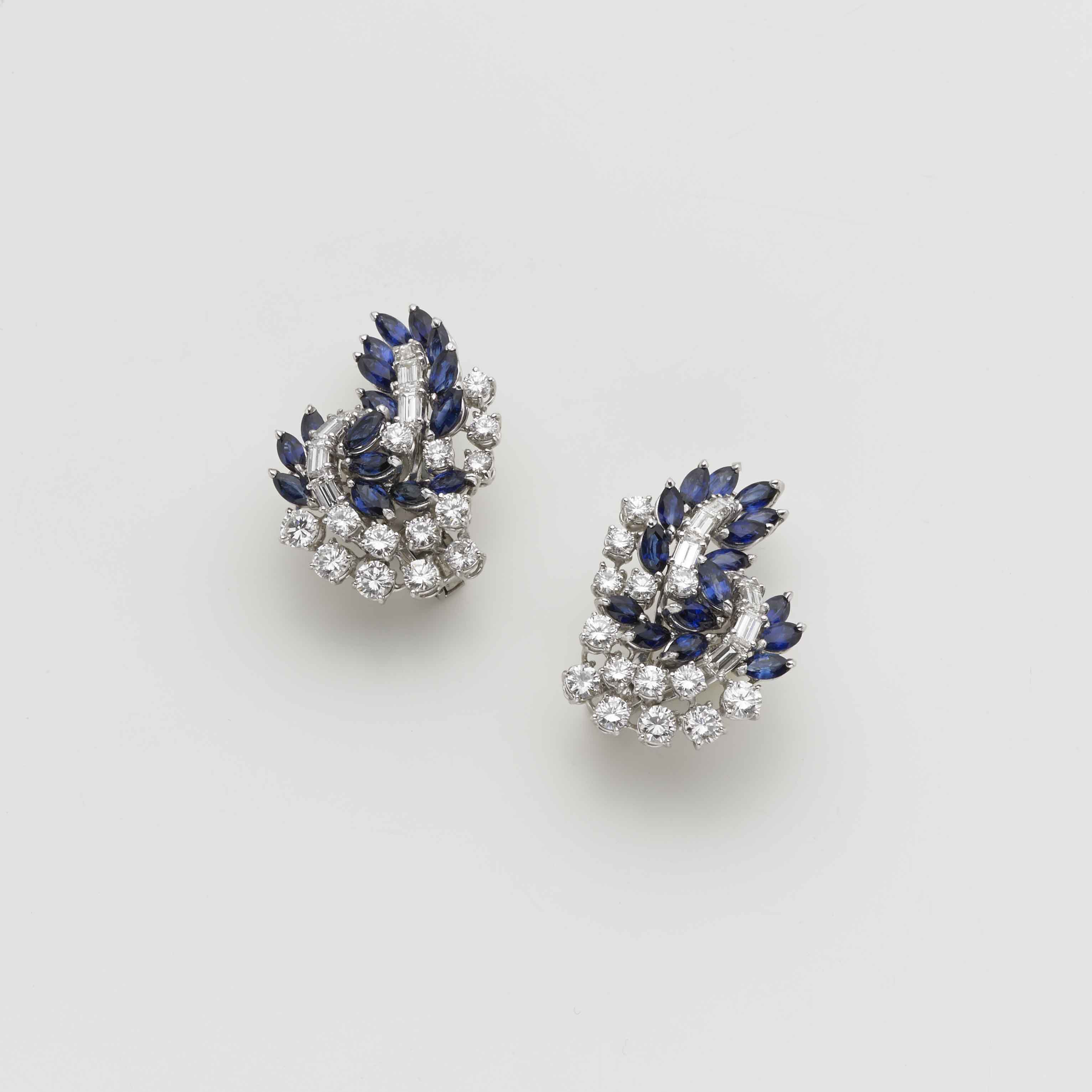 Orecchini a lobo con clips, in platino con diamanti rotondi taglio a brillante, a baguette e zaffiri marquise a completare un disegno floreale. g. 24,20 Platinum earrings with diamonds and sapphires