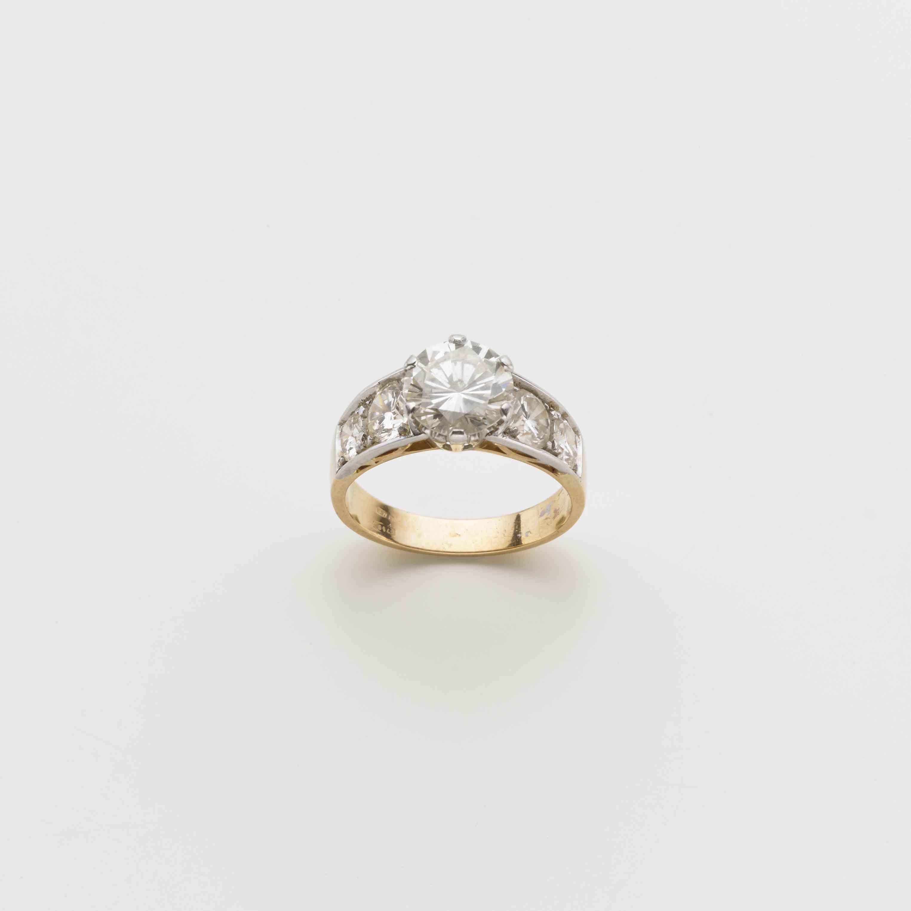 Anello in oro bianco e giallo con al centro un diamante rotondo taglio a brillante di ct 2,08 ed altri quattro sul gambo g. 5,50 misura 15/55 Accompagnato da analisi gemmologica CISGEM n. 1801IAAB Milano 14/10/2015 White and yellow gold ring with diamonds. With appended CISGEM gemmological report