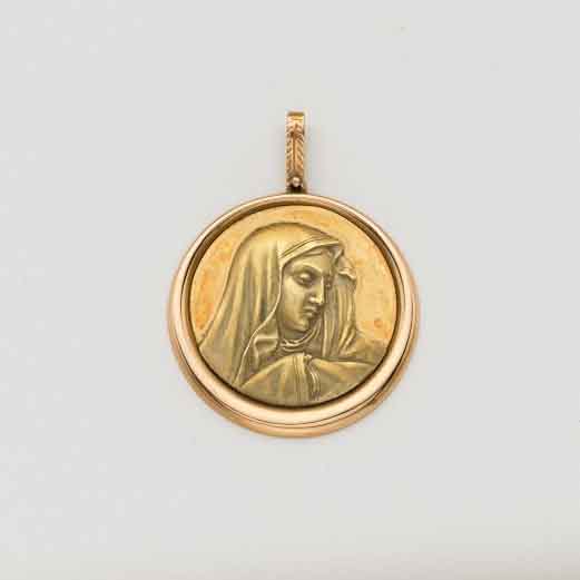 Medaglia in oro rosso e metallo con Madonna lavorata a sbalzo. Gr 10 Red gold and metal medal